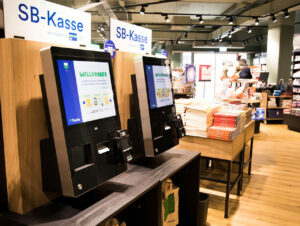 Die Möbel, in die die Selbstbedienungskassen bei Thalia integriert sind, wurden vom Unternehmen selbst entworfen, so dass sich die Systeme optimal in das Ladendesign einfügen, wie Thalia erklärt. Bezahlt werden kann an den Terminals mit Karte oder mobilen Endgeräten wie Smartphone oder Smartwatch.