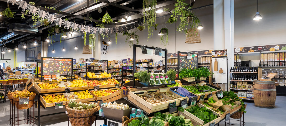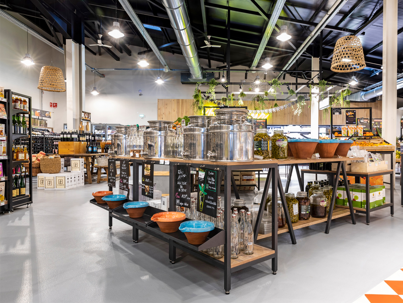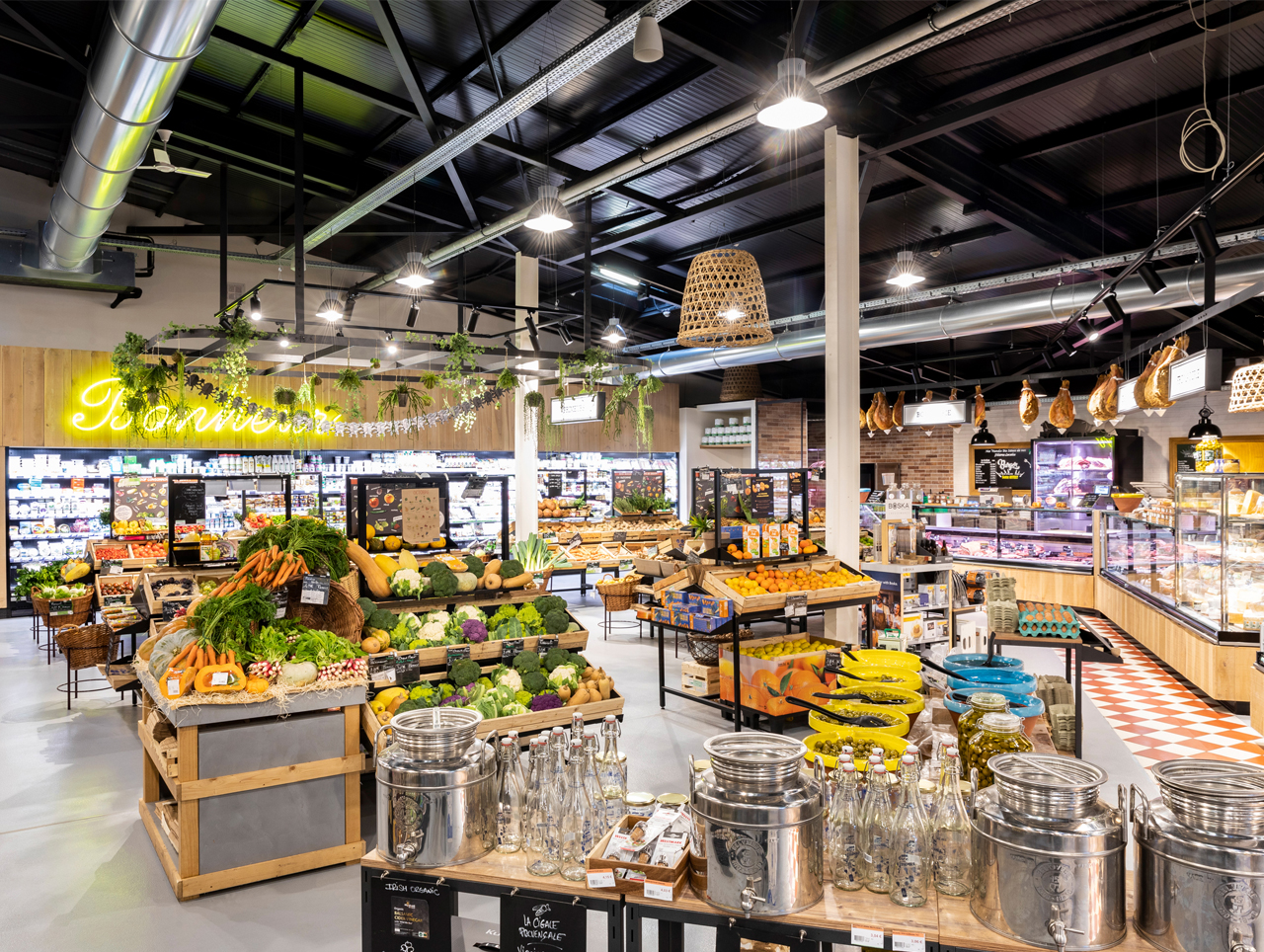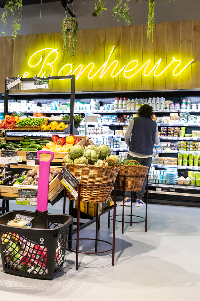Naturverbunden präsentiert sich das Sortiment, aber auch das Interieur des Marktes: Roh- und Edelmaterialien wie Ziegel, Bast, Stahl oder Holz sowie natürliche, gedeckte Farben dominieren. Das verantwortliche Designbüro Felix et Associés gestaltete jede Abteilung als eigene Einkaufswelt.