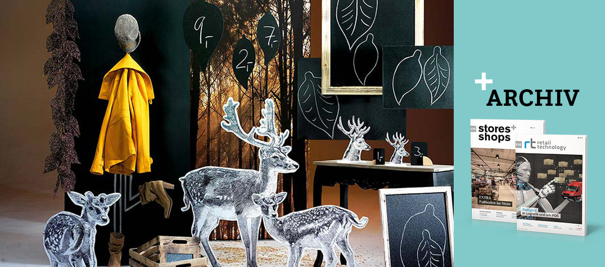 Zentrales Thema ist dabei, im Store für Entschleunigung zu sorgen, zum Beispiel durch Inszenierungen von Landschaften. Ziel soll sein, die Umgebung genießen, den Alltag abstreifen und abschalten zu können. Woerner empfiehlt, das Farbspektrum eines Herbstwaldes zu präsentieren, zum Beispiel mit bunten Herbstblättern in Form von Blätterranken. Aktionen und Angebote können auf Kreidetafeln in Blattform oder Bannern mit Baumstämmen kommuniziert werden. Um Leben in herbstliche Momentaufnahmen zu bringen, eigneten sich Waldtiere als Holz-Aufsteller, in Holz-Optik oder aus Fiberglas vor Bannern mit Naturmotiven. Mit Metallicfolie ließe sich eine Wasseroberfläche simulieren oder ein Hüttencharakter in Szene setzen.