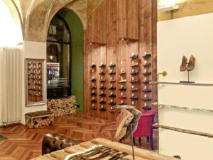 Shoepassion.com ist ein in Berlin ansässiger Online-Anbieter für klassische Herren- und mittlerweile auch Damenschuhe. Die Zimmermannsnägel, die in den stationären Stores von Shoepassion in den Rückwänden als Schuhhalterungen dienen, sehen aus wie eine individuelle kreative Lösung, und die aus alten Holzpaletten gestapelten Präsentationstische wirken urig. „Wir haben so viel Ware auf Paletten bekommen, dass wir irgendwann fast darin untergegangen sind“, erinnert sich Tobias Börner, Unternehmenssprecher von Shoepassion.com. Also wurden Paletten in das Ladenkonzept eingebaut, „und jetzt sind sie fester Bestandteil unserer CI mit Wiedererkennungswert“, genau wie die grüne Wandfarbe, die gestapelten Holzscheite, die Rohrleitungen und die rohen Holzbohlen an Wänden.