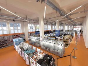 Es ist Zalando gelungen, eine überzeugende ästhetische Entsprechung zum Online-Auftritt zu finden. Das quantitativ schier überwältigende Angebot im 2.500 qm großen Frankfurter Store, der kürzlich ein Facelift erhielt, wird nach dem einfachen Ordnungsprinzip „Damen“, „Herren“, „Kinder“ sowie „Warengruppe“ und „Größe“ gegliedert. Helle, unbehandelte Seekiefer ist das omnipräsente Material für die Möblierung, dazu schwarzer Stahl für Kleiderstangen und Orange als Akzentfarbe zum Beispiel für Wegweiser, des Weiteren offene Decken und markante Beleuchtung, beispielsweise durch Neon-Inszenierungen im Eingangsbereich. An Terminals können die Kunden sich für die Outlet-Kundenkarte registrieren. Verantwortlich für Konzeption, Entwurf und Ausführung inklusive Bauleitung war das Frankfurter Architekturbüro 1100 Architekten Riehm + Piscuskas BDA.