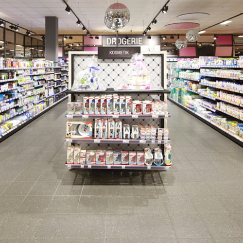 Die Drogerie hingegen ist im Stil der 80er Jahre gestaltet: Fußbodenbilder in Pink und Weiß auf grauem Grund, eine Schminkecke mit Polaroids am Spiegel sowie silberne Discokugeln an der Decke. Bunte, mit kleinen Spots beleuchtete Buchstaben kündigen den „Candy Shop“ im Stil der 50er Jahre vor einem Baldachin wie der eines Karussells an. Hier wurden pastellige Farben genutzt.