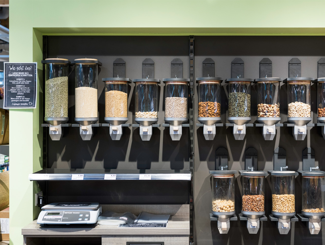 Da auch der Blick in das hintere Verkaufsareal wichtig ist, entschied man sich im vorderen Teil des Ladens für niedrige Regale. Die hohen, semitransparenten Gittertrennwände fungieren darüber als Wegweiser. Höhere, geradlinige Warenträgern präsentieren das Trockensortiment. Regionale Weine werden in rollbaren Weintresen in Szene gesetzt.