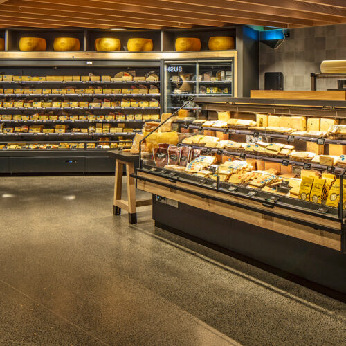 Der einen Marktstand zitierende Obst- und Gemüsestand bildet das Entree für den Frischebereich. Highlight ist eine Fischtheke mit bojenartigen runden Kühltheken. Dahinter werden in einem Räucherofen Fische geräuchert. Neben den Bedientheken werden in den SB-Kühlmöbeln abgepackte Charcuterie-, Fisch-, Fleisch- und Käseprodukte angeboten.
