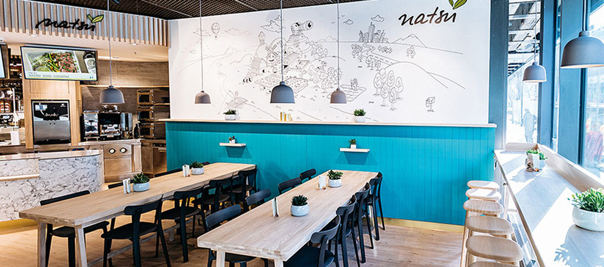 Dass Linoleum und moderne Architektur Hand in Hand gehen, zeigt sich im Supermarket, Berlin. Der für die 800 qm-Fläche in einem dunklen Uni-Ton gewählte Bodenbelag bildet eine ruhige Basis für den flexiblen Ladenbau aus Materialien wie Stahl und Holz, das farbenfrohe Sortiment und die zahlreichen Grünpflanzen.