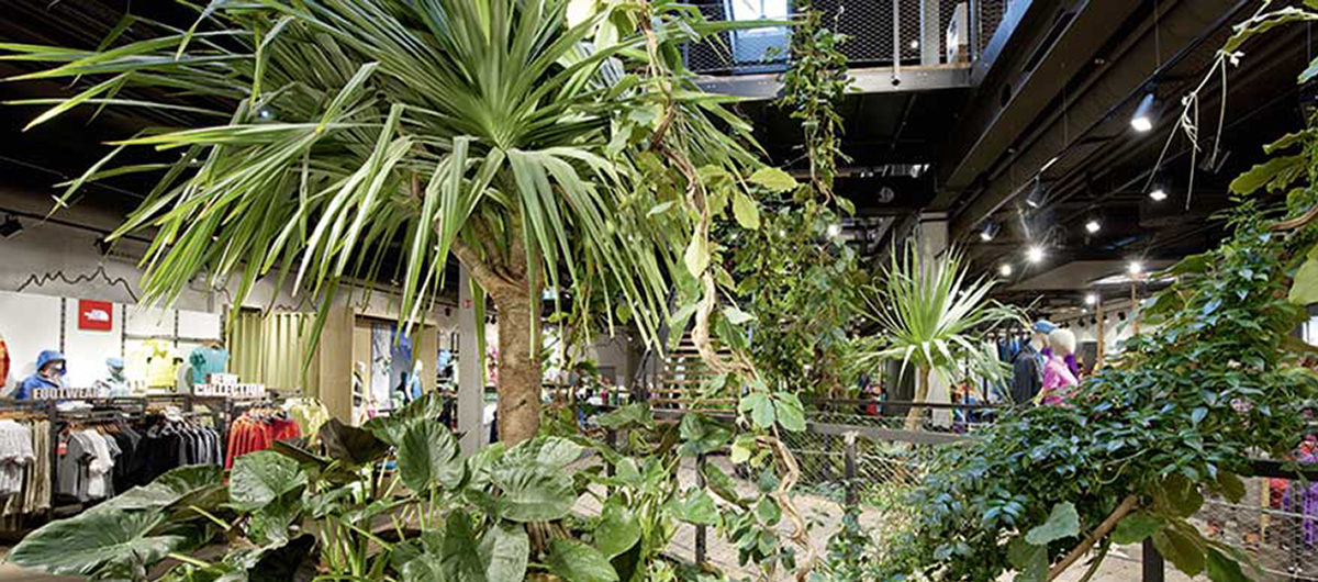 Bei dem Outdoor-Händler Freelander‘s in Luxemburg, einer weiteren ppm-Referenz, fällt in dem 2.300 qm großen Geschäft der Blick auf eine Dschungellandschaft mit echten Mangroven, Baumfarnen und Lianen – ein Kurzurlaub für gestresste Kunden.