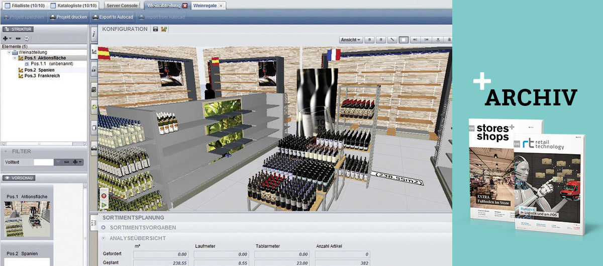 3D-Visualisierungen und branchenbezogene Objektbibliotheken unterstützen die Ausarbeitung von Einrichtungskonzepten. Automatisch lassen sich komplexe Ladenausstattungen, Dekorationselemente und die Warenkollektionen detailliert konfigurieren. Die Einrichtung von Filialen erfolgt durch Platzieren von Einrichtungsmodulen und Planogrammen aus dem 3D-Objektkatalog in den Ladengrundriss.