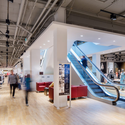 Selbst über große Distanzen in offenen Bereichen von Shopping-Centern kann Licht spektakulär inszeniert werden. Oktalite beleuchtete beispielsweise im Shopping-Center K in Lautern in Kaiserslautern aus der Dachkonstruktion heraus über eine Distanz von 15 m mehrere Etagen. Der eingesetzte Aufbaustrahler „Canilo Plus“ aus dem eigenen Leuchten-Portfolio generiert den dazu notwendigen Lichtstrom von 6.000 Lumen und lenkt über Segment-Reflektoren aus Miro-Material das Licht optimal auf die Zielfläche.