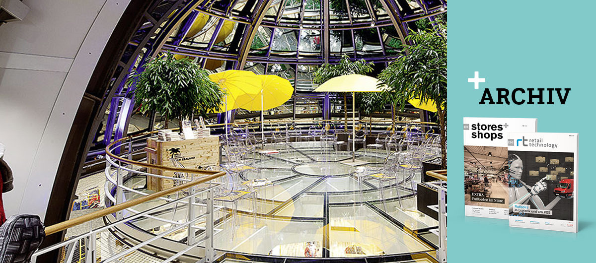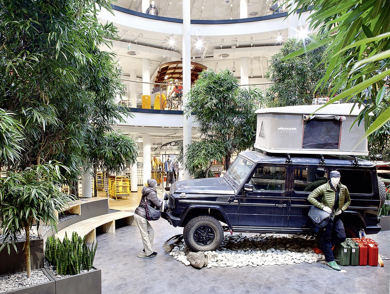 Mit einem Investitionsaufwand von knapp 6 Mio. Euro wurde ein ehemaliges Einkaufszentrum aus den 80er-Jahren in eine Shopping-Destination zum Thema Outdoor verwandelt. Dort, wo zuletzt Enge und Reizüberflutung herrschten, wirken heute Offenheit und Transparenz, schaffen Sichtachsen immer wieder neue optische Eindrücke. Durch den Wegfall der großen Rolltreppe entstand ein zentraler Luftraum über 4 Etagen, der von einer Glaskuppel überspannt wird. Auf einer 140 qm großen gläsernen Plattform befinden sich ein Café und eine Reisebibliothek.