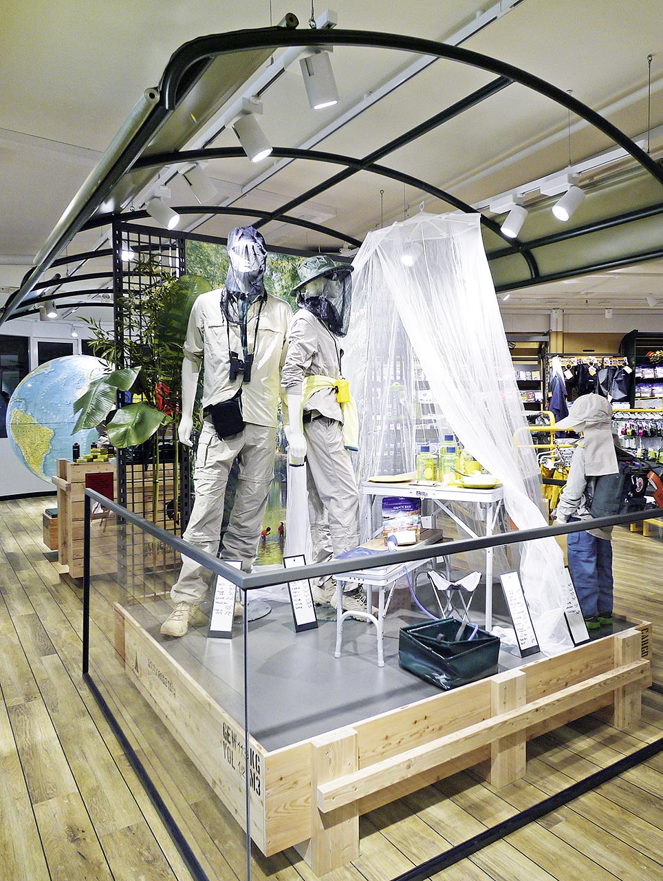 9 Themen-Inseln präsentieren auf den Etagen mit insgesamt 4.500 qm Verkaufsfläche die komplette Produktwelt rund um Camping, Wassersport, Alpinski und andere sportliche Freizeitaktivitäten. Ladenbau und Visual Merchandising schaffen innerhalb der Themenwelten enge Bezüge zu Reiseerlebnissen und Fortbewegungsmitteln – von Transportkisten, die als Schuhwand dienen über einen Jeep auf der Eventfläche bis zu Gepäckwagen vom Bahnhof, die zu Textilpräsentern umfunktioniert wurden. Typisch für Globetrotter, kann die Ausrüstung unter „realen“ Bedingungen getestet werden, beispielsweise in einer Sturmkammer mit bis zu Windstärke 10 oder an einer Boulderwand für Klettersport.