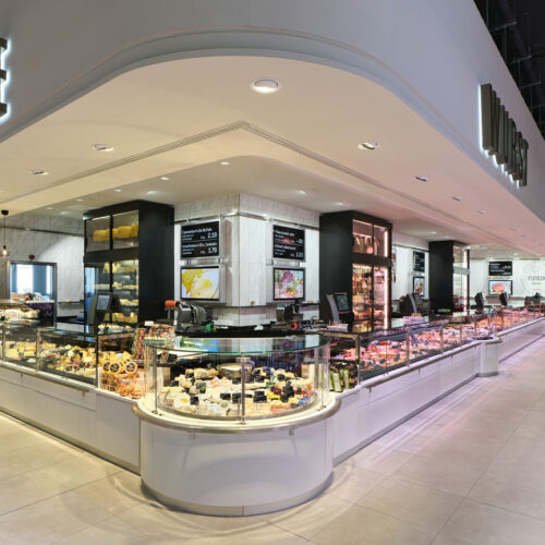 Die sich daran anschließende Obst und Gemüseabteilung ist die Visitenkarte des Marktes und wird dementsprechend u. a. mit frischen Farben in Szene gesetzt, um eine einladende Atmosphäre zu erschaffen. An der Stirnseite des Marktes, etwas abseits des Kundenlaufs, befinden sich Weine und Spirituosen inklusive einer Bar. In der knapp 200 qm großen, weniger stark frequentierten Abteilung sollen Kund:innen in gemütlicher und ruhiger Atmosphäre ungestört stöbern und sich setzen können. Zwei Sommeliers sind beratend im Einsatz.