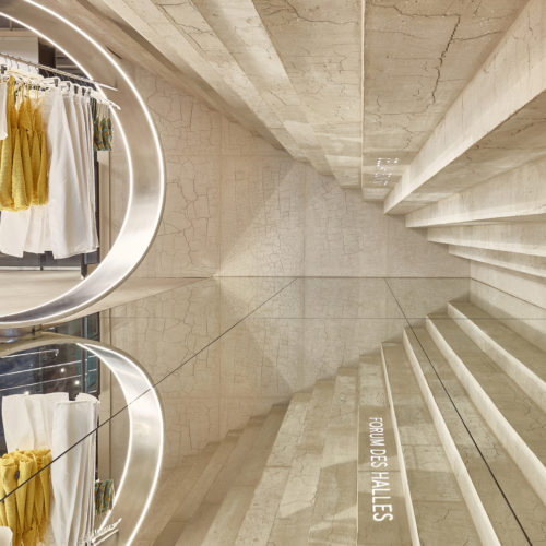 Eine breite, über dem Store liegende Treppe aus Lehmputz setzt architektonische Akzente. Zahlreiche Mannequins geben Ideen für modisches Styling. Display-Tische in Grau und farbigem Glas präsentieren T-Shirts und mehr für ein junges Sommer-Outfit. Das Storedesign wurde vom hauseigenen Architekten-Team entworfen.