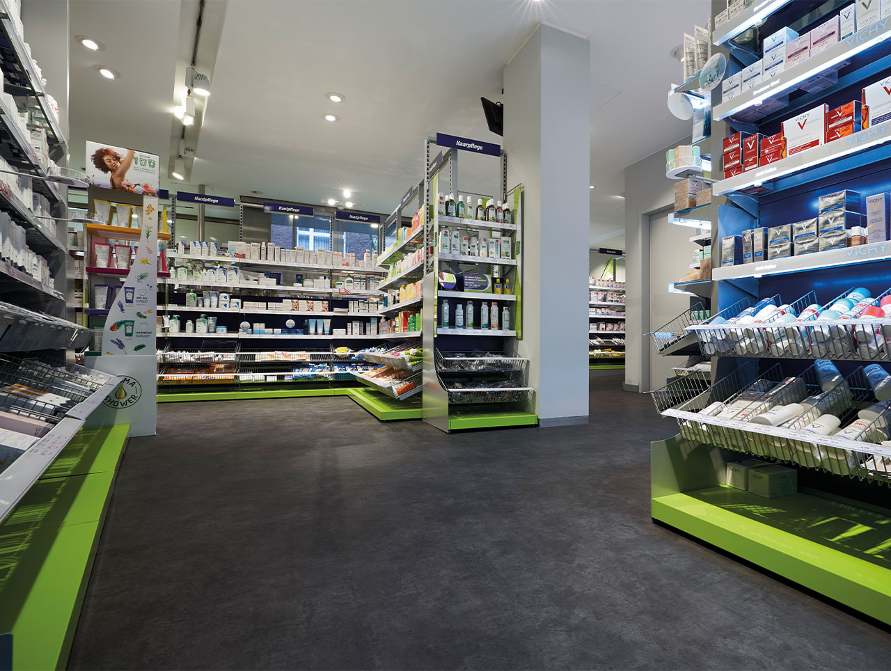 Ausschließlich hochfrequentierte Standorte kommen für die 135 Filialen der Systemapotheken Easy Apotheke in Frage. Das gilt auch für die Ende 2020 neueröffnete Filiale nahe des Münsteraner Bahnhofs. Aufgrund des lebhaften Publikumsverkehrs waren die Anforderungen an den Bodenbelag besonders hoch: Er sollte absolut unempfindlich gegen Schmutz, Nässe oder Steinchen sein; zudem sollte er schnell und unkompliziert verlegt werden und ganz besonders gut aussehen. Daher kam hier ein Loose-Lay-Designbelag zum Einsatz, dessen Fliesenelemente aufgrund ihrer Schwalbenschwanzverbindung klebstofffrei und ohne Geräusch- und Staubentwicklung verlegt wurden. Die dunkle, changierende Betonoptik ist extrem unempfindlich und sollte daher langfristig dankbar im Gebrauch sein.