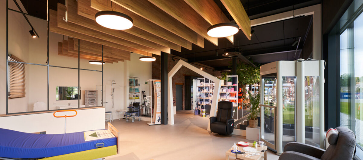 Weg vom reinen Bedarfskauf auf der Sanitätshausfläche hin zur ganzheitlichen kompetenten gesundheitlichen Versorgung – diesen Transformationsprozess startete Onvio Saniätshaus im Jahr 2023 nach fast 30 Jahren als wachsender Gesundheitsdienstleister. Sichtbar wird der Wandel in der Dieselstraße 1 auf einer Gesamtfläche von 1.400 qm. Neben der 370 qm großen Verkaufsfläche gehören zum Sanitätshaus Verwaltungs-, Schulungs- und zwei Konferenzräume sowie Lagerflächen. Der tageslichtdurchflutete Raum gliedert sich in Themenwelten und Produktpräsentationen. Highlight ist ein beleuchtetes, knapp drei Meter langes Podest, auf dem Elektromobile inszeniert werden. Eine Kaffee-Ecke und Kunstbaum setzen visuelle Akzente. Eine Outdoor-Teststrecke für E-Scooter und eine Parkbank runden das Interieur des Concept Stores ab.