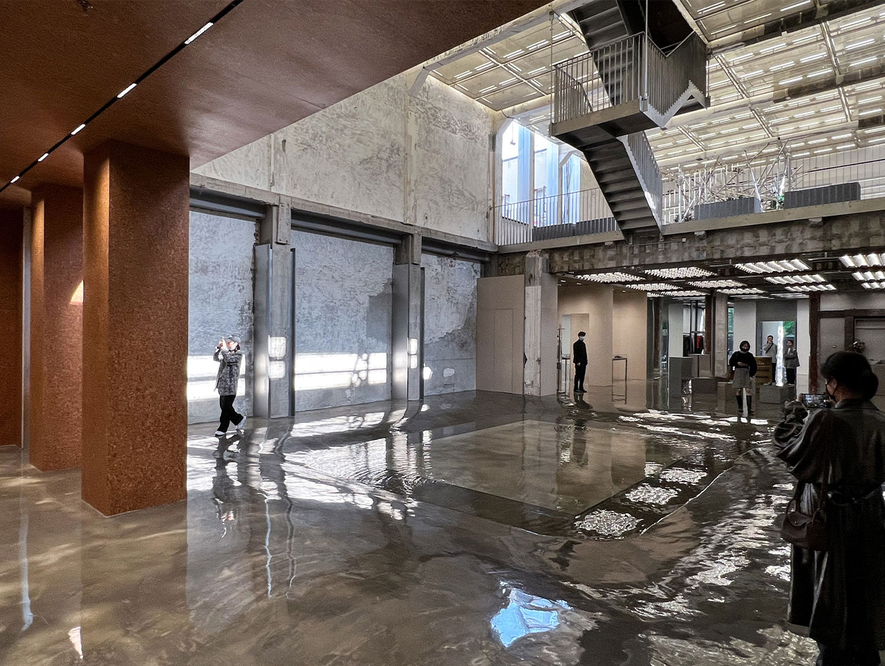 Die ehemalige, dreistöckige Handtuchfabrik, mit deren Renovierung das ebenfalls in der Metropole am Huangpu-Fluss beheimatete Büro Dongqi Design beauftragt wurde, beherbergt nun ein neues Mode- und Kunstzentrum und wartet mit einigen besonderen Features auf: einem Klangtunnel im Erdgeschoss etwa, der die Kund:innen mit einem experimentellen Musikerlebnis empfängt, oder der riesigen, leeren Halle eines dreistöckigen Atriums, deren räumliche Weite durch ein Wasserbassin wie durch verspiegelte Decken und Wände noch zusätzlich unterstrichen wird. Rohe Flächen, jeglicher Dekoration beraubte Treppen und alte Terrazzo-Böden betonen den industriellen Charakter und geben dem Store ein ungewöhnliches, markantes Gesicht.