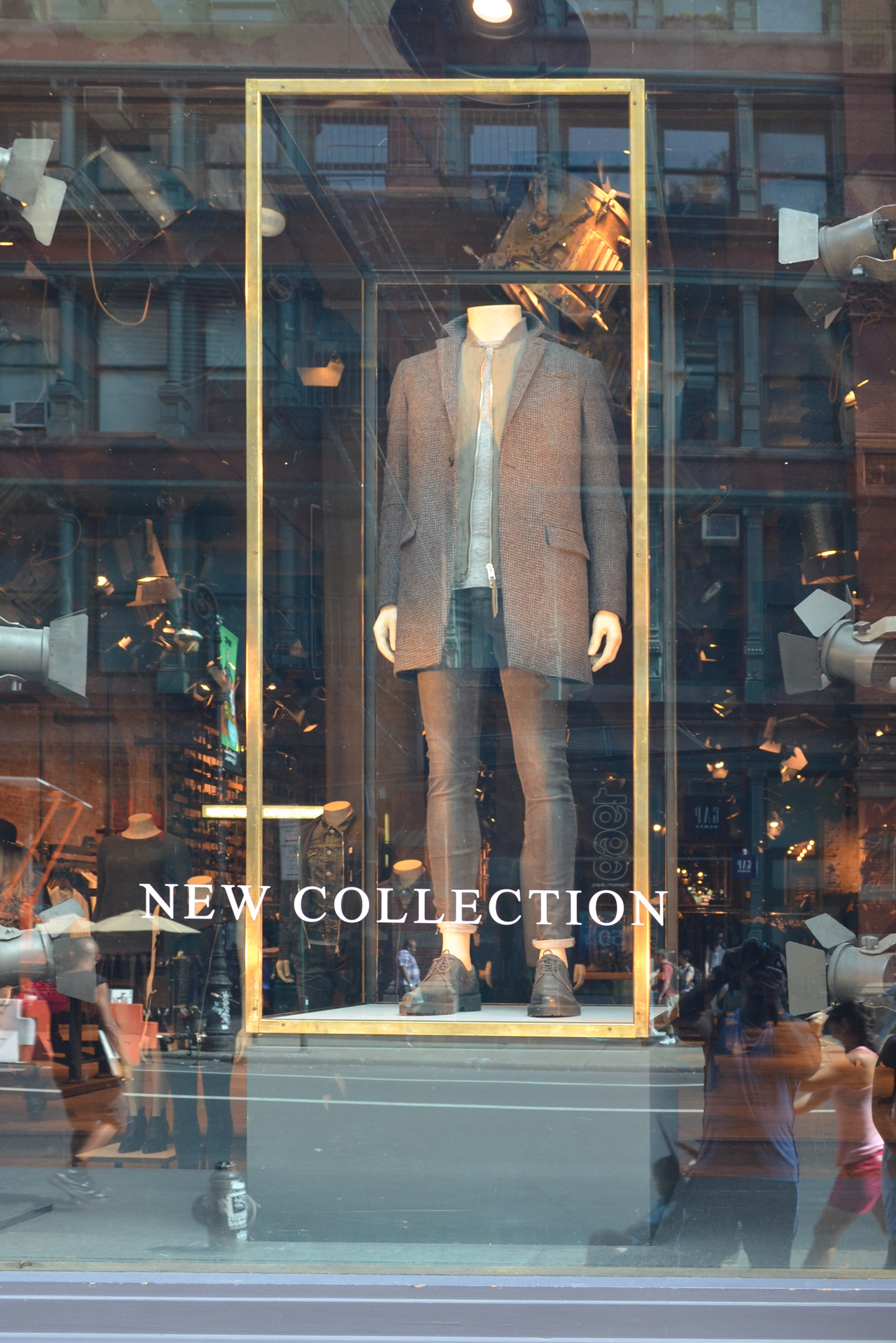 Bei „Outline Objects“ handelt es sich um einen starken Trend, der zunehmend auch in hiesigen Schaufenstern zu sehen ist. Dabei werden klare geometrische Figuren, meist Kuben, nur anhand ihrer Kontur dargestellt. Zum Beispiel werden Rahmen – oft aus Holz oder Metall – genutzt, um darin Mannequins oder Ware auf Bügeln und Präsentern zu positionieren. Die klare Silhouette des Kubus inszeniert die Ware und schafft einen natürlichen Fokus. „Von American Eagle über DKNY bis zu Stella McCartney – eine ganz simple und umso wirkungsvollere Inszenierung“, lobt Löbbel und führt aus, dass die einzelnen Objekte auch durch eine Glaswand ergänzt werden können. So lasse sich eine Kommunikationsfläche schaffen, ohne den Gesamteindruck der Präsentation zu stören.