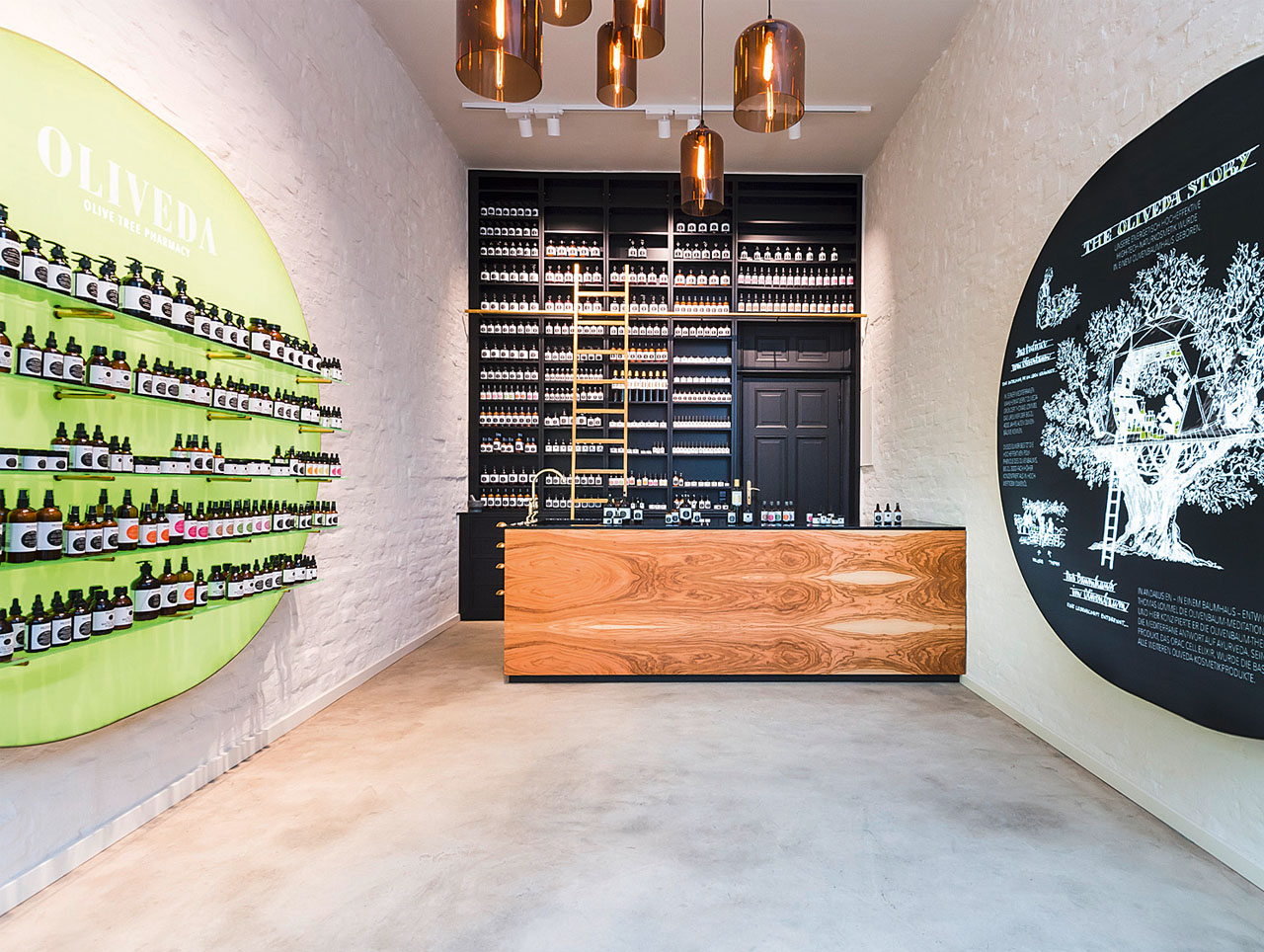 Das Produkt im Raum erlebbar machen – in einer puristischen, aber keineswegs kühlen Atmosphäre: Flagshipstore von Oliveda, Anbieter von Kosmetik auf Olivenöl-Basis, auf der Schönhauser Straße in Berlin-Mitte mit Verkaufstresen aus Olivenholz und „Oliven-Stammbaum“ fürs Storytelling an der Wand (Foto:Dfrost)