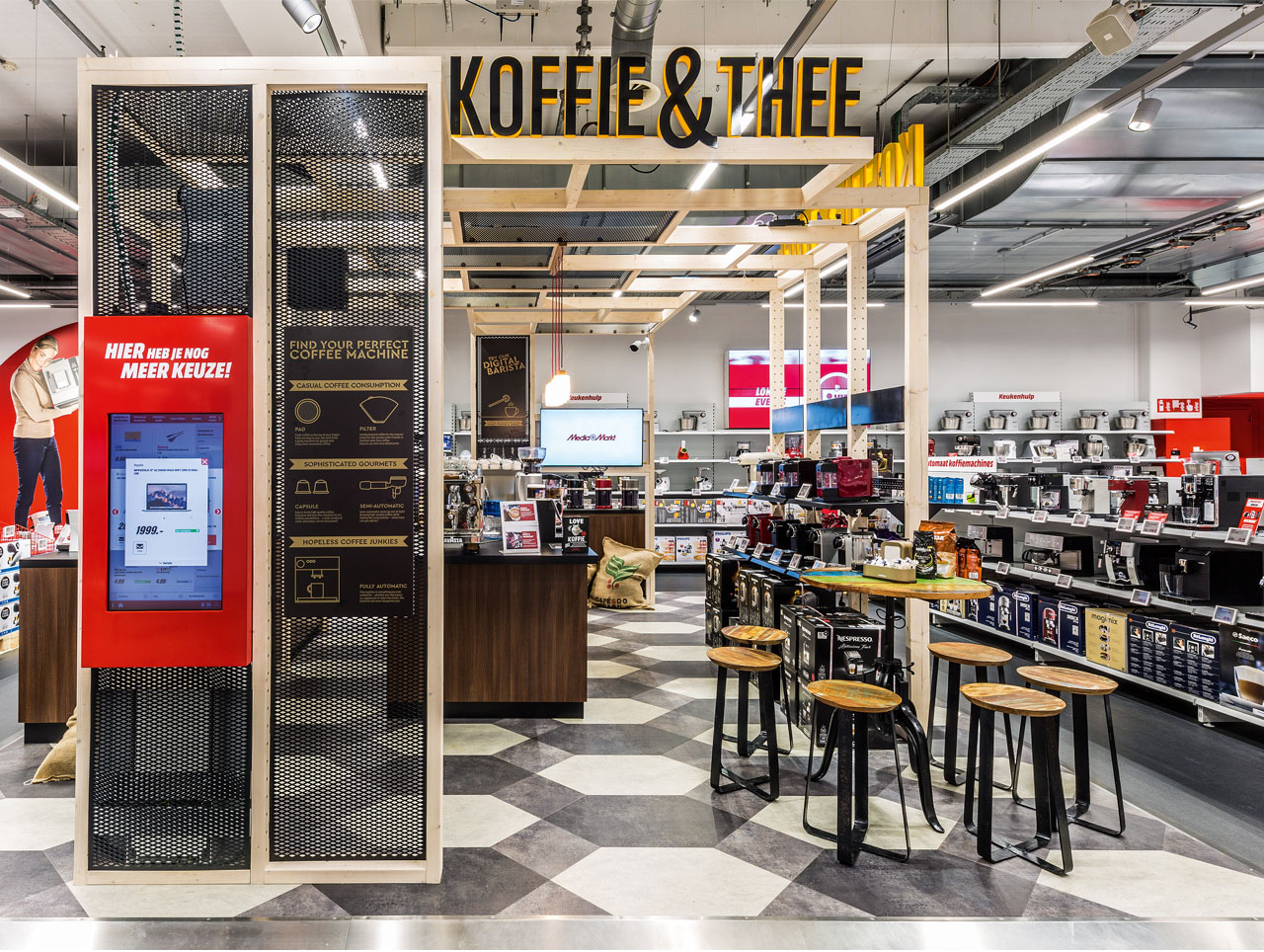 Media Markt steigert das Ambiente: „Themen-Pavillon“ im Markt Wilrijk, einem Stadtteil von Antwerpen in Belgien. Ein Barista zelebriert hier Kaffee-Genuss. (Foto: Schwitzke Group)