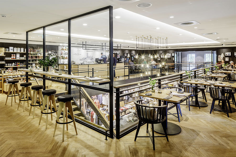 Mit der eigenen Gastronomie betritt das St. Gallener Modehaus Weber Neuland. Die knapp 100 qm große Fläche verbindet die umliegenden Verkaufsbereiche miteinander. Die an der Decke angebrachten Akustik- und Beleuchtungselemente leiten in den Fashion-Bereich über, gleichzeitig sorgen semitransparente Glaswände für getrennte Sphären, ohne zu sehr abzuschirmen. Das nordisch inspirierte Ambiente schafft mit hellem Holz und natürlichen Farben „Cosiness“. Wichtig war dem in dritter Generation geführten Familienunternehmen auch die Anordnung der insgesamt 50 verschiedenen Sitz- und Verweilmöglichkeiten: Barhocker, Loungebereich, ein Stammtisch oder Esstischstühle an sorgfältig gedeckten Tischen – und die Einbindung von thematisch passenden Retail-Produkten, beispielsweise Essig und Öl oder Gewürze.