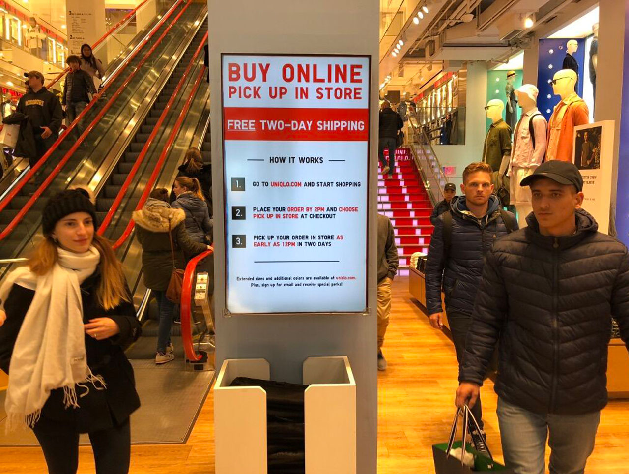 Auch die Uniqlo-Boutiquen sind wie begehbare Onlineshops designt. Der Händler zeigt neben dem Preisschild zu jedem Kleidungsstück auch ein Foto, das die Kleidung an einer Person präsentiert. Für die Jeans-Abteilung kreierte der Modehändler kleine Icons, die die Passform und Merkmale der einzelnen Jeanstypen klassifizieren. All diese Elemente könnten so auch im Onlineshop vorhanden sein.