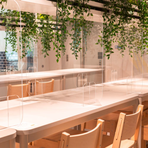 Eine klare Formensprache und helle Farben prägen die 350 qm große Fläche des schwedischen Restaurants im siebten Stock des City-Shops. Kräftige Grün- und Rottöne sowie Pflanzen setzen Akzente.