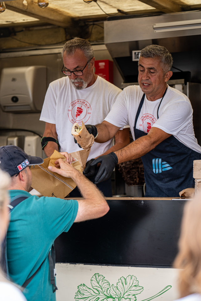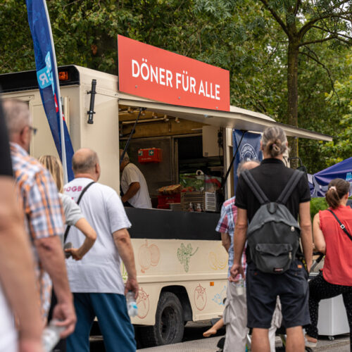 Analog zum Unternehmens-Claim „Gutes für alle“ hat Aldi Süd die Roadshow mit „Döner für alle“ benannt und zeigt sich damit an vier Tagen innerhalb von weniger als zwei Wochen in landesweit vier Städten. Den Anfang machte am 7. August die Filiale in der Ahnfeldstraße in Düsseldorf, danach folgen Mainz, München und zuletzt Nürnberg am 16. August. Die jeweiligen Standorte sind sowohl für Kund:innen aus dem Stadtzentrum als auch aus den umliegenden Stadtteilen erreichbar.
