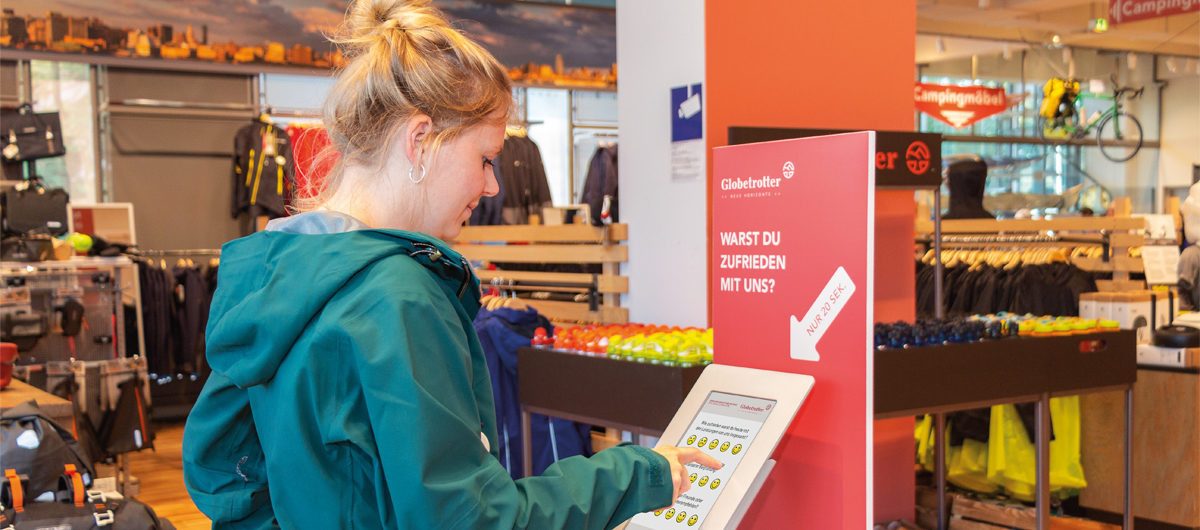 Die Befragung erfolgt in einem als spielerisch bezeichneten Ansatz mit Smiley-Symbolen und Bildern. Zudem gibt es ein offenes Textfeld, in dem Kunden ihr Feedback eingeben können. Pro Woche gehen bei Globetrotter immerhin rund 2.000 Kundenstimmen ein. Die Bewertungen und Kommentare der Kunden laufen in einer zentralen Online-Management- Plattform zusammen. Das Feedback aus Terminals, Online-Bewertungen und Mitarbeiterbefragungen wird vollautomatisiert ausgewertet und ist per Browser mit jedem internetfähigen Endgerät einsehbar.