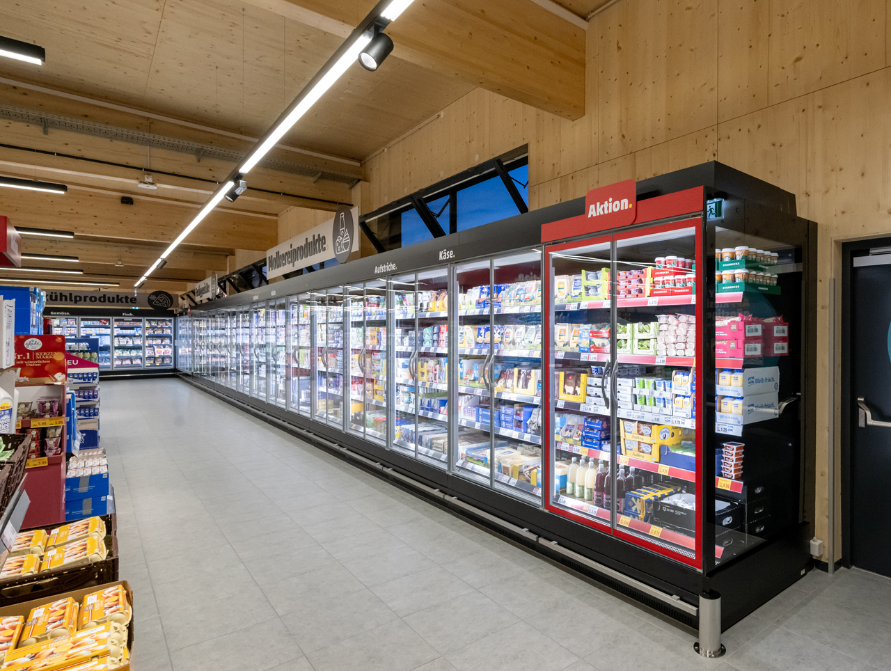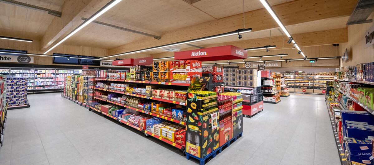 Auf der Verkaufsfläche im Betriebsgebiet Jochen ½ kommen eine klare Wegeführung, modernisierte Frischezonen und eine übersichtliche Sortimentspräsentation zum Tragen. Fichtenholz aus heimischem Anbau ist das zentrale Gestaltungselement und gibt dem Gebäude eine warme, moderne Optik. Das Personal kontrolliert Obst und Gemüse im Zweistundentakt; Beratung durch Metzgereifachverkäufer:innen sowie Gebäck aus regionalen Bäckereien sind Teil des Konzepts.