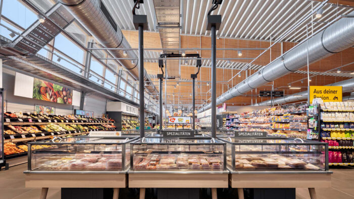 Die 400 qm große Obst- und Gemüseabteilung mit Tageslichteinfall, dekorativen Leuchten und holzverkleideten Warenträgern mit Grafiken von stilisierten Obst- und Gemüseprodukten ist ein Anziehungspunkt. Eine holzverkleidete Rückwand verkündet augenzwinkernd „An apple a day keeps the doctor away!“ und wird in Kombination mit einem dort platzierten digitalen Screen zum Blickfang. Wer im Anschluss das übliche Frühstückssortiment erwartet, wird überrascht. Stattdessen locken die für gewöhnlich kurz vor dem Checkout platzierten Süßwaren zu Impulskäufen. „Süßwaren stehen bei den meisten Kund:innen auf dem Einkaufszettel, aber wenn es schneller gehen muss oder das Budget ohnehin begrenzt ist, stehen die Chancen, dass Süßwaren am Ende des Einkaufs noch mitgenommen werden, deutlich schlechter als zu Beginn“, ist Engelhardt überzeugt. Im Kundenlauf folgen Biowaren, Kaffee und Tee-Spezialitäten sowie die ebenfalls absatzstarken Aufbackwaren, Fertiggerichte, Nudeln und Saucen.