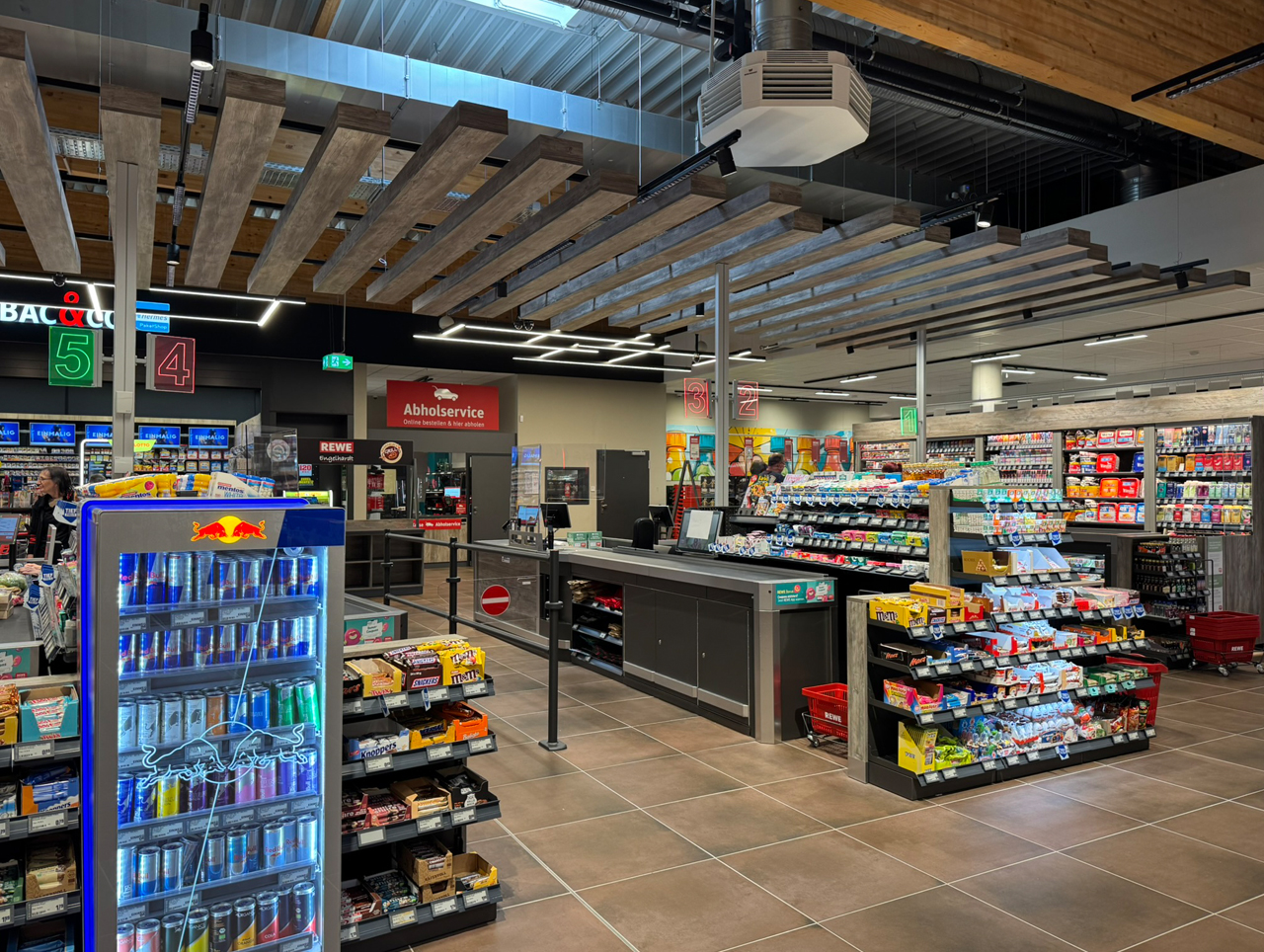 Die 400 qm große Obst- und Gemüseabteilung mit Tageslichteinfall, dekorativen Leuchten und holzverkleideten Warenträgern mit Grafiken von stilisierten Obst- und Gemüseprodukten ist ein Anziehungspunkt. Eine holzverkleidete Rückwand verkündet augenzwinkernd „An apple a day keeps the doctor away!“ und wird in Kombination mit einem dort platzierten digitalen Screen zum Blickfang. Wer im Anschluss das übliche Frühstückssortiment erwartet, wird überrascht. Stattdessen locken die für gewöhnlich kurz vor dem Checkout platzierten Süßwaren zu Impulskäufen. „Süßwaren stehen bei den meisten Kund:innen auf dem Einkaufszettel, aber wenn es schneller gehen muss oder das Budget ohnehin begrenzt ist, stehen die Chancen, dass Süßwaren am Ende des Einkaufs noch mitgenommen werden, deutlich schlechter als zu Beginn“, ist Engelhardt überzeugt. Im Kundenlauf folgen Biowaren, Kaffee und Tee-Spezialitäten sowie die ebenfalls absatzstarken Aufbackwaren, Fertiggerichte, Nudeln und Saucen.