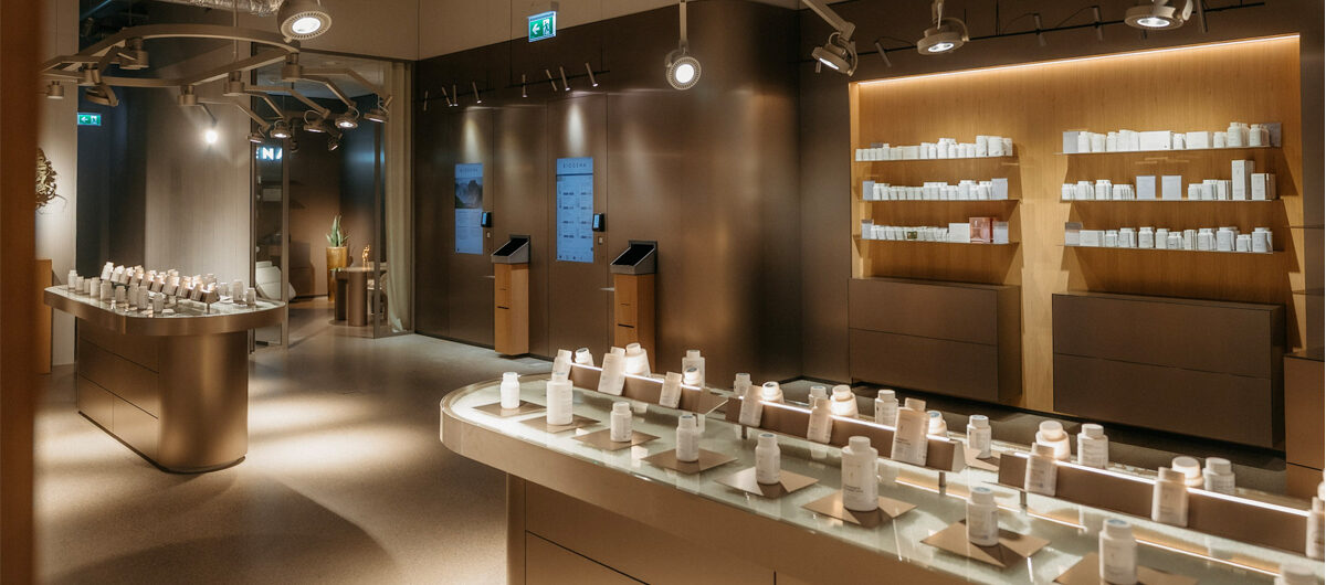 Beim Interieur verfolgte Biogena das Ziel, die Marke sinnlich erfahrbar zu machen und die Produkte so zu präsentieren, dass sie möglichst selbsterklärend wirken, erläutert Geschäftsführerin und Head of Business Development & Expansion Julia Hagenauer bei der Eröffnung. Für weiterführende Beratung stehen ausschließlich ausgebildete Mikronährstoffcoaches und Ernährungswissenschaftler:innen bereit. Das Storedesign soll die Markenwerte widerspiegeln: Eloxiertes Aluminium trifft auf Altholz, Eichenelemente und rotbraunen Travertin. Das technisch wirkende Aluminium symbolisiere medizinisches Know-how und Qualitätsanspruch, Holz stehe für Bodenständigkeit und Natürlichkeit, so Hagenauer. Zahlreiche Leuchten, inspiriert von Labor- und OP-Settings, setzen visuelle Akzente, während hinterleuchtete Regale und Tische die Produkte inszenieren. Semi-transparente Vorhänge verleihen den Treatment-Bereichen einen Hauch von Intimsphäre.