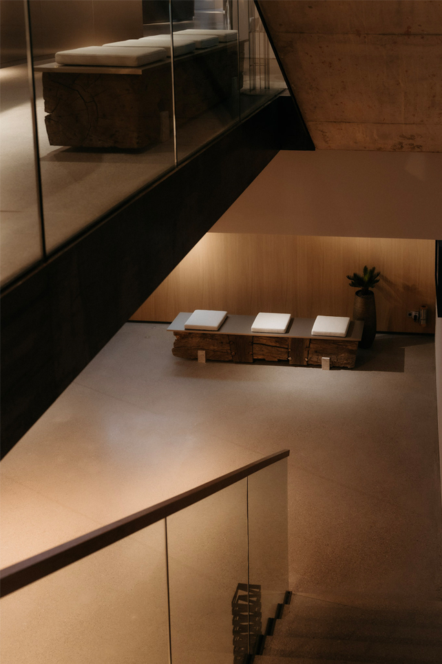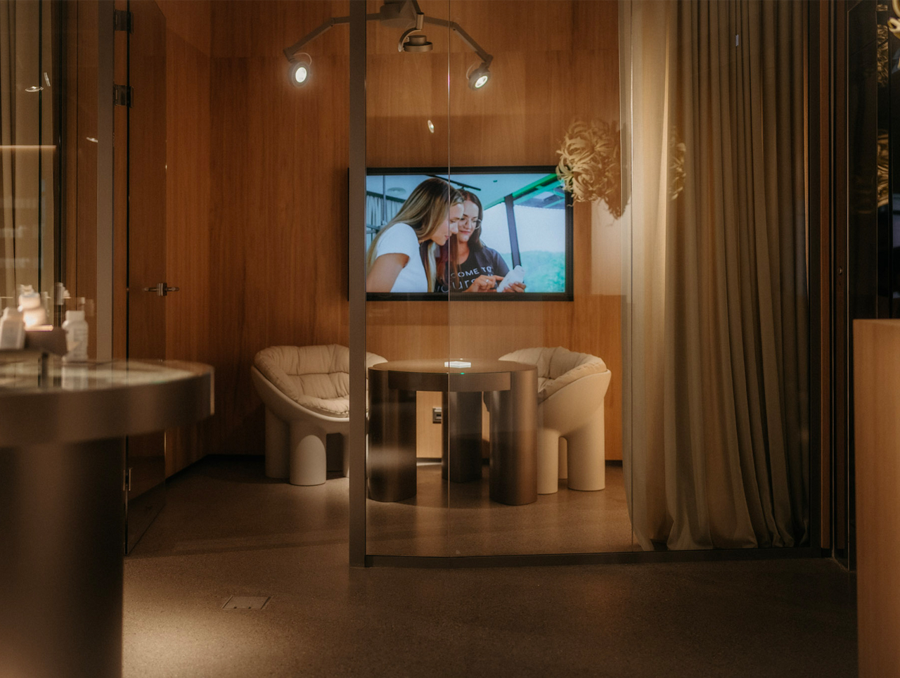 Im Erdgeschoss empfängt ein Infotresen die Besucher:innen. Hier werden Gäste begrüßt, Getränke ausgeschenkt und Produktverköstigungen angeboten. Eine „Brand Wall“ erzählt die Familiengeschichte, während digitale Screens Einblicke in die Produktion gewähren. Die präsentierten Produkte sind ausschließlich auf dieser Ebene zu finden. Im Ober- und Untergeschoss befinden sich die Behandlungsräume sowie eine Bar und Lounge-Bereiche.