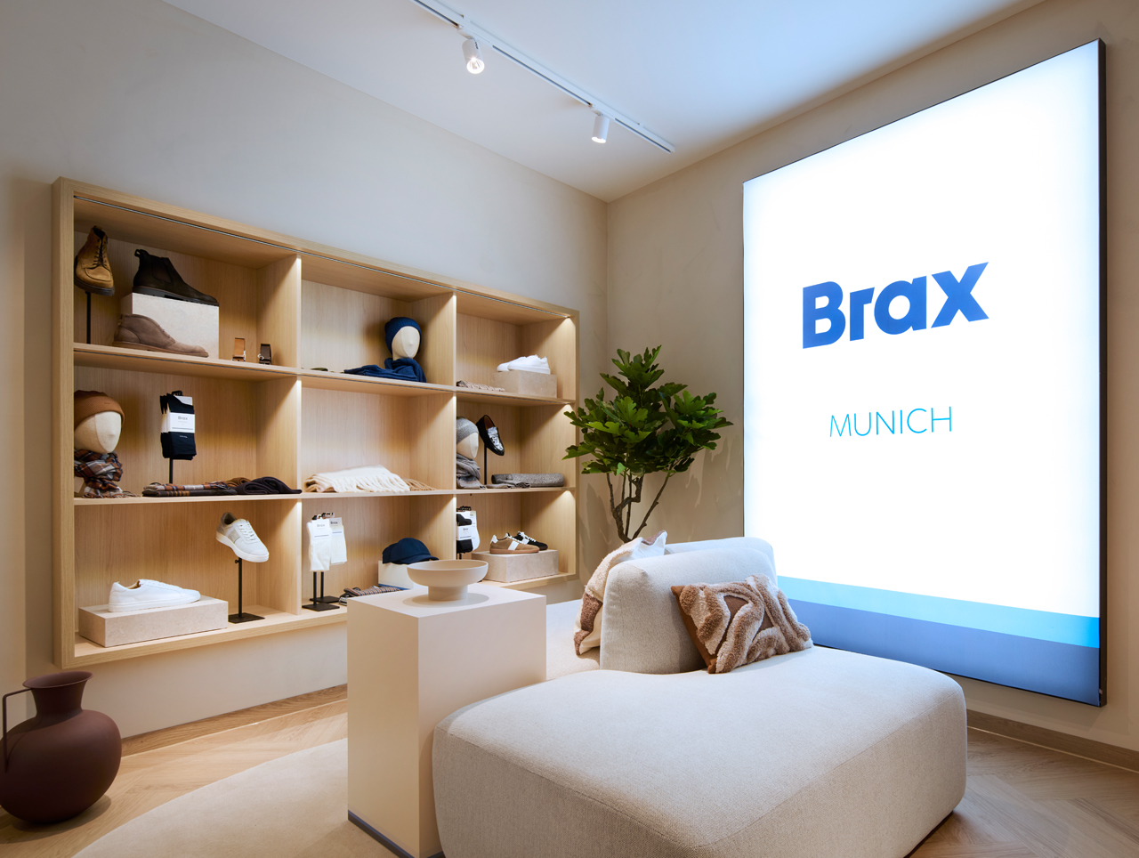 Im Store werden die aktuellen Kollektionen der Marke für Frauen und Männer präsentiert. Das neue Konzept ist geprägt von hellen Holzoberflächen, klaren Linien und einer reduzierten Formsprache. Dezente anthrazitfarbene Akzente sollen Elemente der Brax-Markenwelt aufgreifen. Im Store ist ein Loungebereich mit Coffee Bar eingerichtet, der die Verweildauer im Geschäft erhöhen soll. Vor Ort arbeiten sieben Angestellte. Zur Eröffnung erhielten die ersten 100 Kundinnen und Kunden eine Goodie Bag.