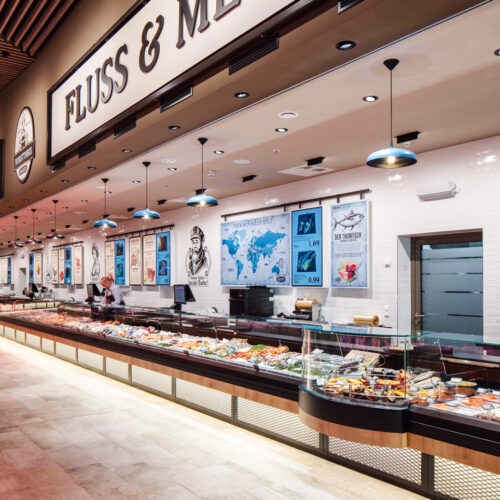 Für mehr Übersichtlichkeit bleiben alle Regale auf maximal 1,60 m Höhe begrenzt. Eine geradlinige Regalstruktur soll für intuitive Orientierung sorgen, ohne dass dabei eine Laufrichtung vorgegeben wird. Eine besondere Lösung haben die Betreiber für die Platzierung der Abteilung Molkereiprodukte gefunden: Sie befindet sich im Zentrum des Marktes. „Auf großen Flächen kann die Marktmitte leicht zu einer wenig frequentierten Zone werden. Deshalb haben wir die Mopro-Abteilung zentral positioniert. Sie fungiert als Ankerpunkt und sorgt dafür, dass sowohl die Mitte als auch die umliegenden Regale belebt bleiben“, begründet Dr. Maximilian Kohler diese Entscheidung.