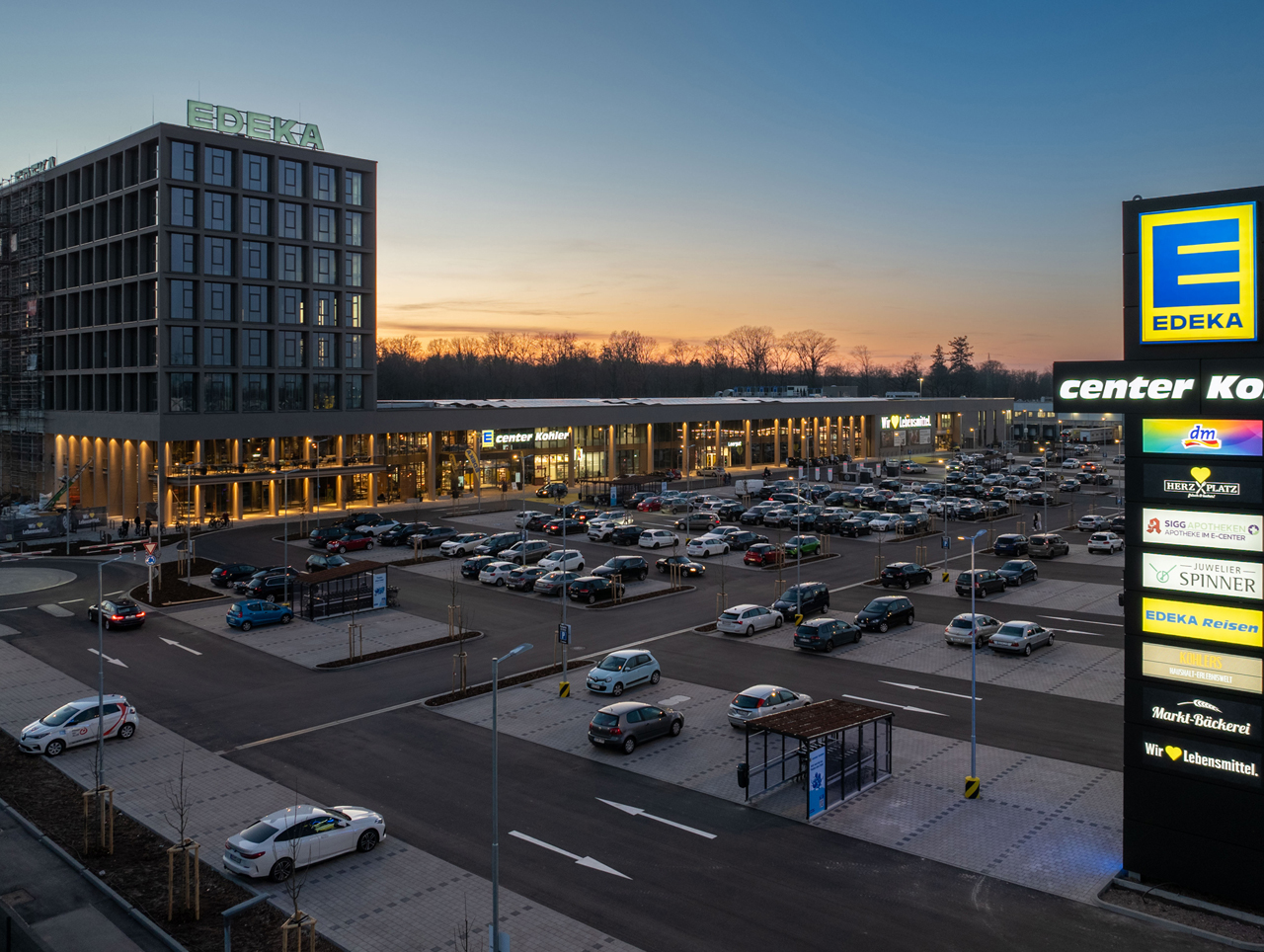 Das E-Center wurde als KfW-Effizienzgebäude 40 EE errichtet und kommt ohne fossile Brennstoffe aus. Die Beheizung erfolgt über eine Wärmepumpe mit natürlichem Kältemittel, unterstützt von einer im Retail bis dato noch eher selten eingesetzten Betonkerntemperierung und einer großflächigen Photovoltaikanlage. „LED-Beleuchtung, Kühlregale mit Glastüren, eine hocheffiziente CO2-Kälteanlage und Wärmerückgewinnung gehören zum Energiekonzept“, so Uwe Kohler. Für E-Fahrzeuge stehen sechs Schnellladesäulen bereit, während Regenwasserzisternen mit je 40.000 Litern Kapazität zur Bewässerung der Außenanlagen beitragen. Ein Teil der Dachfläche des Markts ist mit ökologisch sinnvoller Bepflanzung angelegt.