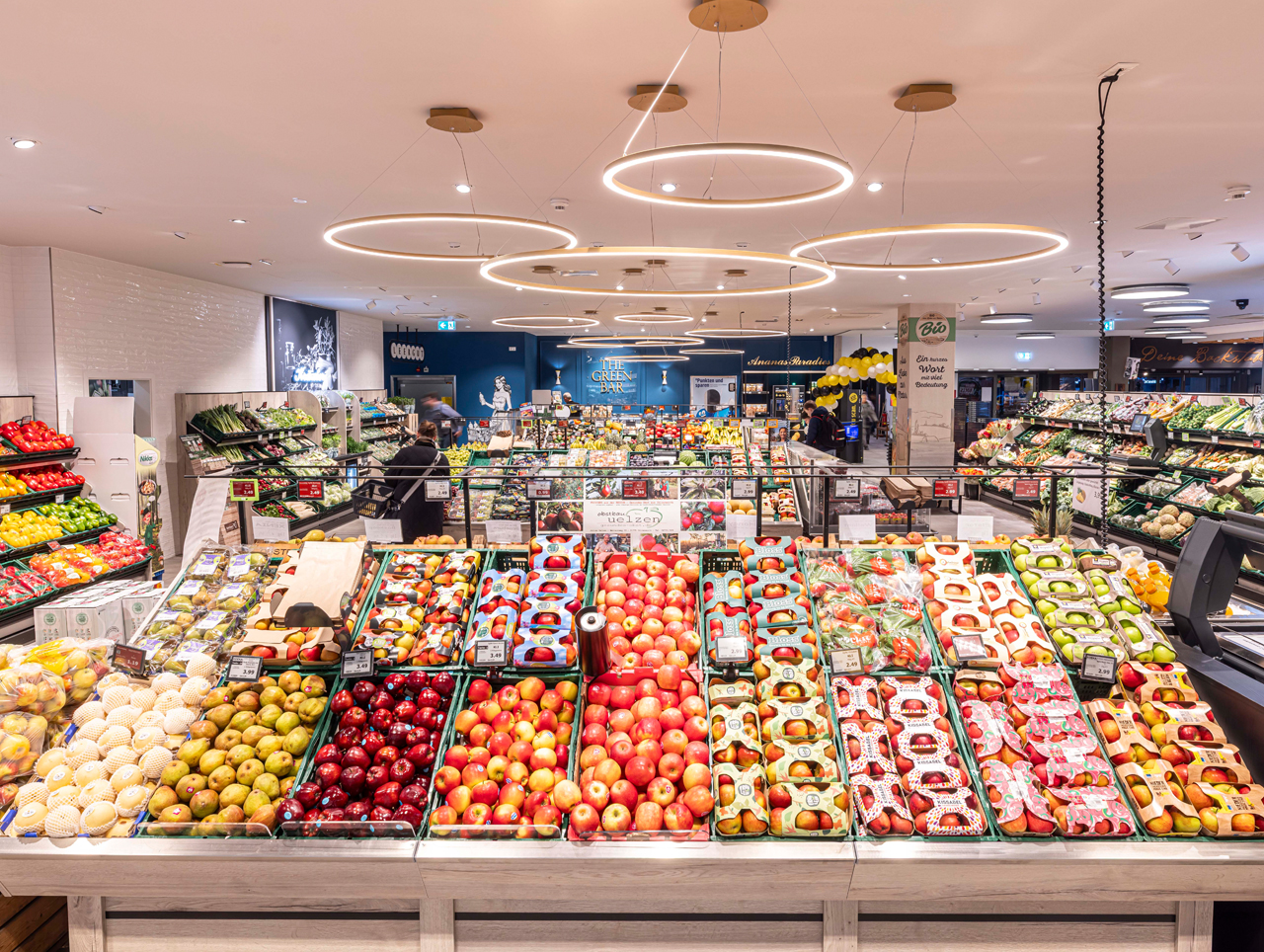 Die Bedientheken für Fleisch, Wurst, Käse und Fisch bilden Schwerpunkte der Verkaufsfläche. In der Obst- und Gemüseabteilung finden sich heimische und saisonale Produkte sowie exotische Früchte. An einer Salatbar werden täglich Salate vor Ort zubereitet. Jürgen Maaß: „Besonders stolz sind wir auf die großzügigen Bedientheken sowie auf die besondere Atmosphäre, die unser neuer Markt bietet.“