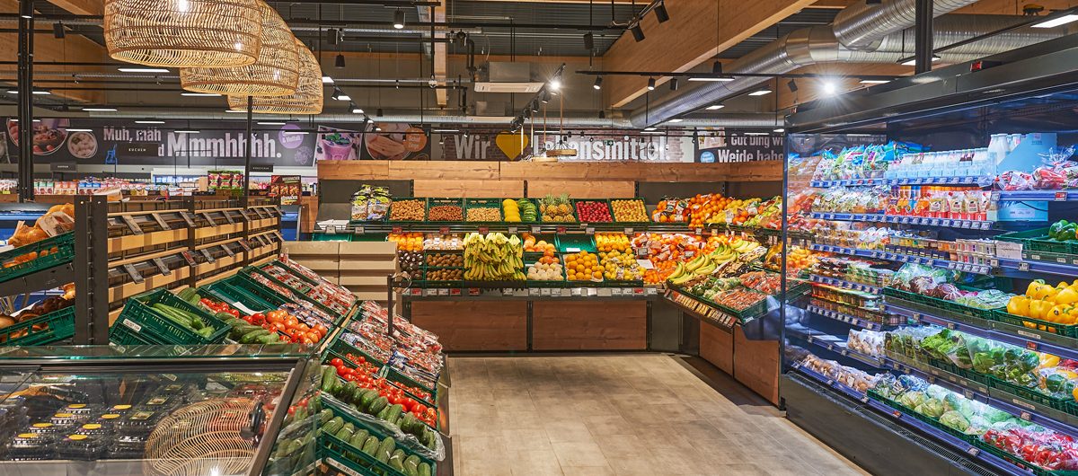 Großzügige Theken für Fleisch, Wurst und Käse bieten weitere hochwertige regionale Produkte wie „Gutfleisch Strohschwein“ und eine fachkundige Beratung. Abgerundet wird das Sortiment durch eine Salat- und Antipastibar. Im Vorkassenbereich lädt die ortsansässige Bäckerei „Mien Backstuuv“ drinnen wie draußen zum Verweilen ein.