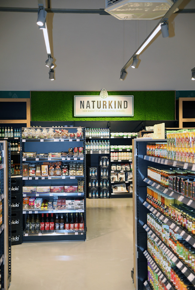 Schlichte Warenregale aus FSC-zertifizierten Holz und pulverbeschichtetem Stahl reihen sich an breiten, ausgeleuchteten Gängen entlang. Verglaste Kühlmöbel und eine Wärmerückgewinnungsanlage sollen das klimabewusste Profil ebenso schärfen wie E-Ladesäulen für E-Bike und E-Autos vor dem Markt. Im gesamten Markt wurde auf die Verwendung nachhaltiger Materialien Wert gelegt, z. B. prangt das Logo an mehreren mit echtem Moos bewachsenen saftig grünen Wandscheiben, die für gute Luft im Raum sorgen sollen. Die von ITAB eigens mit Naturkind entwickelte bediente Tandem-Kasse im Eingangsbereich verfügt über gepresste Moosseitenplatten aus pestizidfreiem Boden. Auf eine elektrische Preisauszeichnung wurde bewusst verzichtet, da der erhöhte Batteriebedarf nicht im Einklang mit Nachhaltigkeit steht.