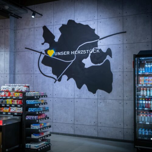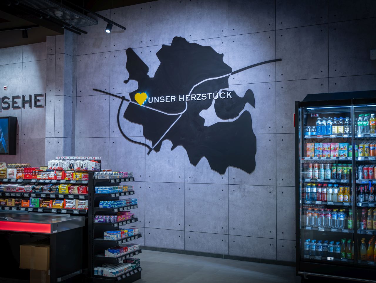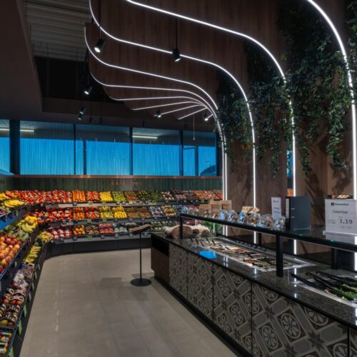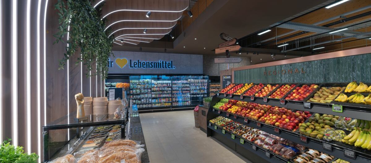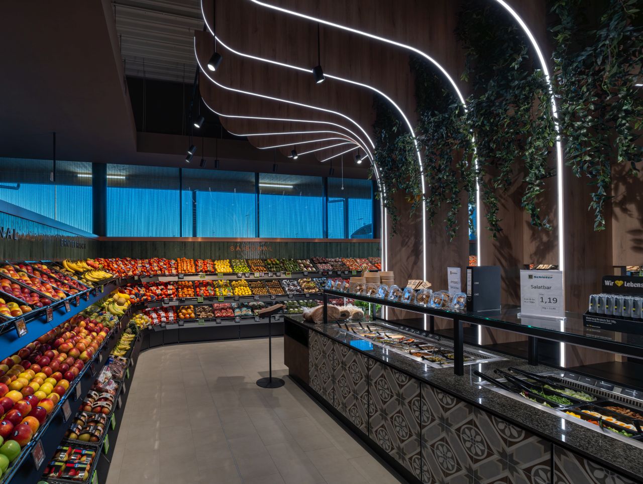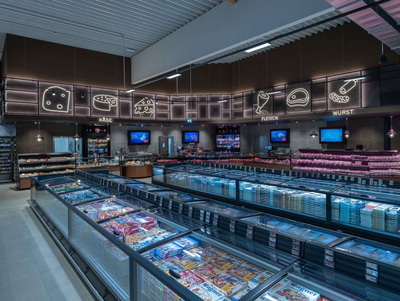 Mit rd. 30.000 Artikeln auf rd. 2.500 qm Verkaufsfläche bietet der neue Markt ein deutlich erweitertes Sortiment. Im Mittelpunkt stehen die Bedientheken für Fleisch, Wurst und Käse mit einem hohen Anteil an eigenhergestellten Produkten. Ergänzt wird das Frischeangebot durch ein Rondell mit hausgemachten Salaten, eine großzügige Bioabteilung mit Biofachsortiment sowie eine außergewöhnlich gestaltete Süßwarenwelt, den „Candy Club“. Hier können Kund:innen individuelle Süßigkeiten-Tüten zusammenstellen oder frisch zubereitetes Popcorn kaufen.