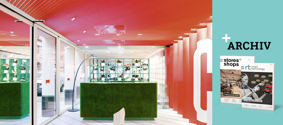 Die Kassentheke wird dem Markenkern gerecht: Sie ist knallgrün mit einer Oberfläche aus Kunstrasen. Sie ist aus Holz gefertigt und hat zudem Glasverblendungen. Stark ist der Farb-Dreiklang aus den Komplementärfarben Rot und Grün mit Weiß. Die hellen Sitzbänke aus Recycling-Material sind Modelle des Systems „10 Unit“ von Artek. Der ebenfalls rot-weiß diagonal gestreifte Fußboden ist aus Kunstharz und unterstreicht die dynamische Linienführung dieses einmaligen Stores. Die Beleuchtung stammt von iGuzzini. Jeder Store von Camper hat ein eigenständiges, ausgefallenes Design und bietet seinen Kunden weltweit einen Grund mehr, den Store aufzusuchen.