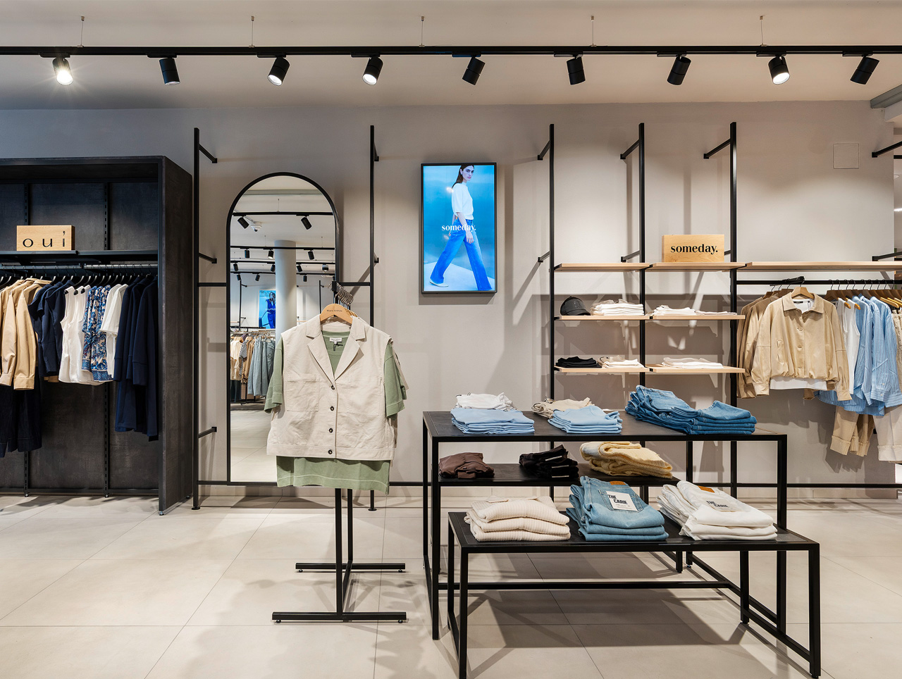 Deckenhängende Stangensysteme in Schwarz und ein zentraler Präsentationstisch kennzeichnen die Damen-Premium-Abteilung
