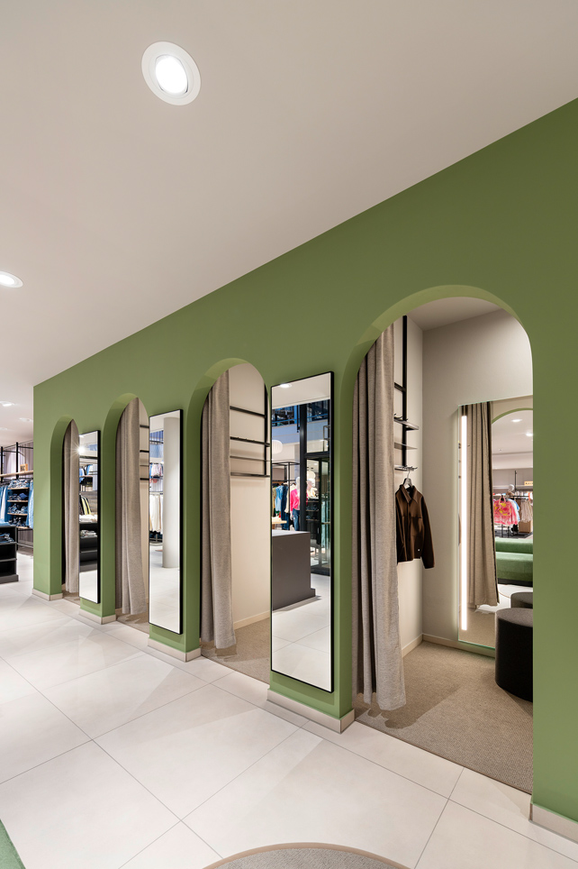 Für die Warenpräsentation kommen flexible Möbelsysteme zum Einsatz. Warenträgersysteme mit variabel positionierbaren Fachböden ermöglichen eine schnelle Anpassung an wechselnde Sortimente und Anlässe. Mehrere Bestandsregale wurden neu verkleidet und wieder integriert. Zum Servicekonzept des Modehauses gehört neben dem Einkauf die hauseigene Schneiderei, die Änderungen und Anfertigungen vor Ort ermöglicht.