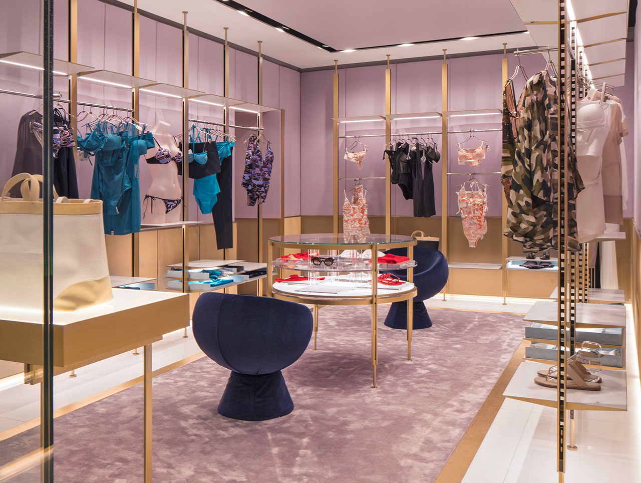 Über 240 qm auf zwei Etagen erstreckt sich die neue Boutique. Geometrische Strukturen in Gold, vor blauem Hintergrund optimal in Szene gesetzt, prägen das Interieur im Erdgeschoss. Saphirblaue Teppiche mit feinen metallenen Streifen auf weißem Marmorboden setzen das Spiel der Farbkontraste und Geometrien fort. Im dunkelblauen Himmel aus Aluminium findet sich ebenfalls die zarten Diagonalstreifen wieder. Die Wände, die mit puderblauen Paneelen bedeckt sind, überlagern partiell goldene, Raumteiler-ähnliche Gitterwände. Sie sind inspiriert von feinem Tüllgewebe, wie es in der Wäscheverarbeitung Verwendung findet. Ein Stützpfeiler im Raum, der komplett rundum mit Spiegeln verkleidet wurde, verstärkt durch die Spiegelbilder erneut den Effekt der Geometrien und Farbkombinationen. Eine weiße Marmortreppe führt hinauf in die erste Etage, die in vier Räume mit Präsentationsnischen und goldgerahmten Spiegeln unterteilt ist. Das Design der Räume bewegt sich durch ein Farbspektrum von Lila über Amethyst hin zu tiefem Purpurviolett in der VIP-Suite, die den besten Kunden vorbehalten ist.
