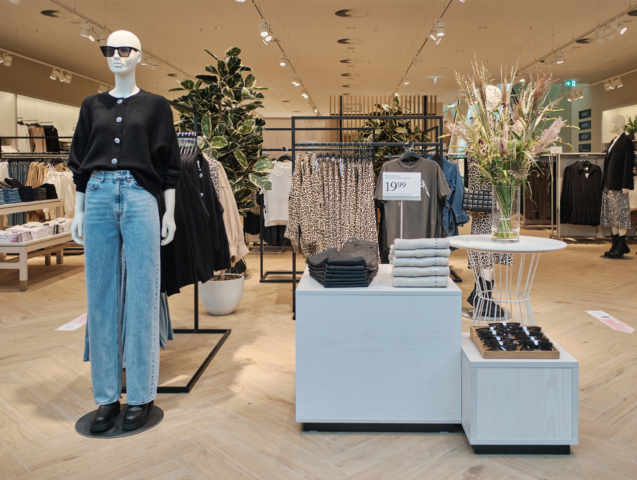Auch Pflanzen und freistehende Spiegel runden den Look ab. Lounges mit Sitzmöbeln laden im Bereich der Anproben zum Verweilen ein. Im gesamten Geschäft ist kostenloses WLAN verfügbar. In der Kids-Area gibt es eine einladende Fläche zum Malen für die Kleinen in Form eines kindgerechten Tisches mit einem Baum in der Mitte.
