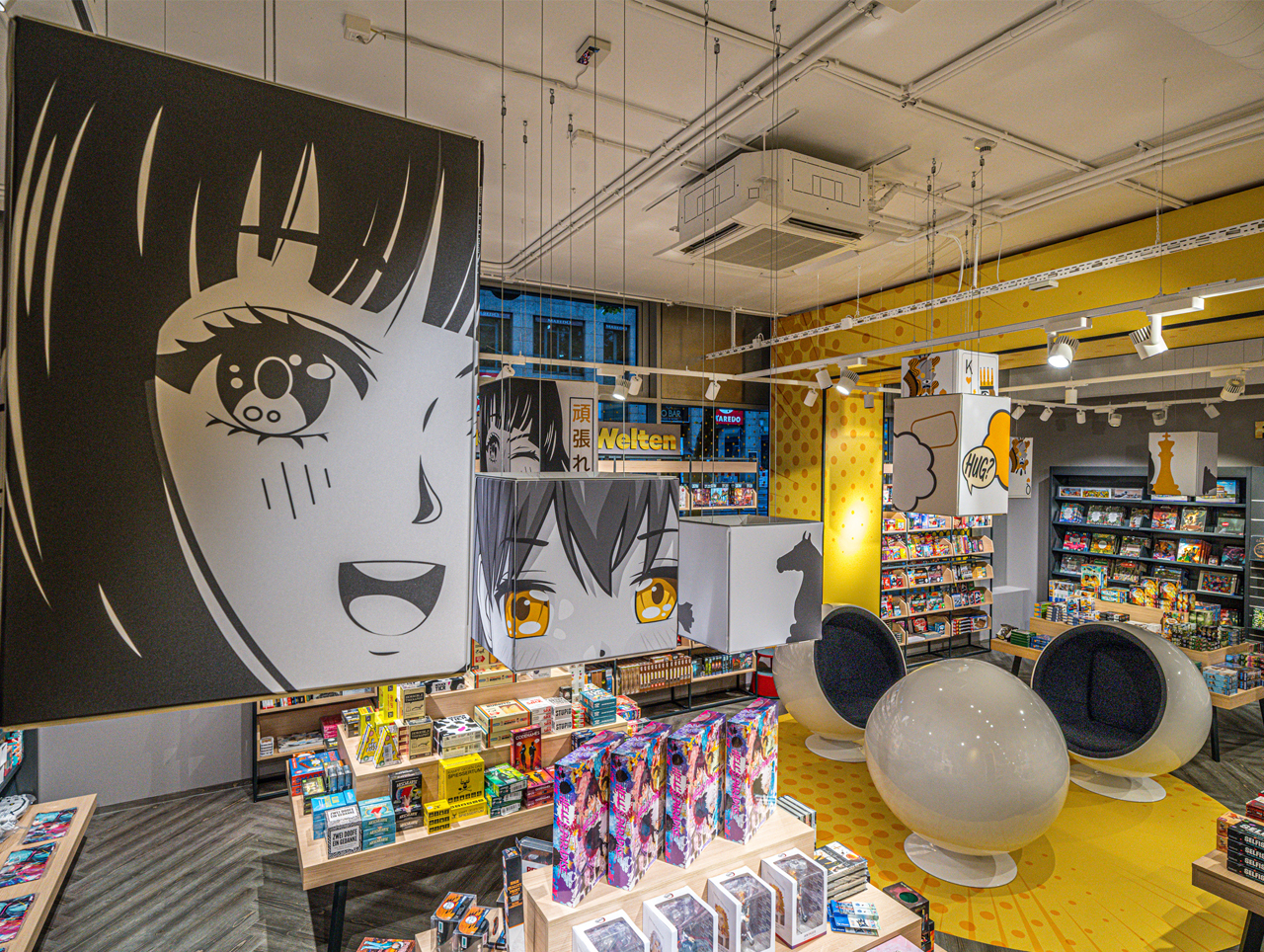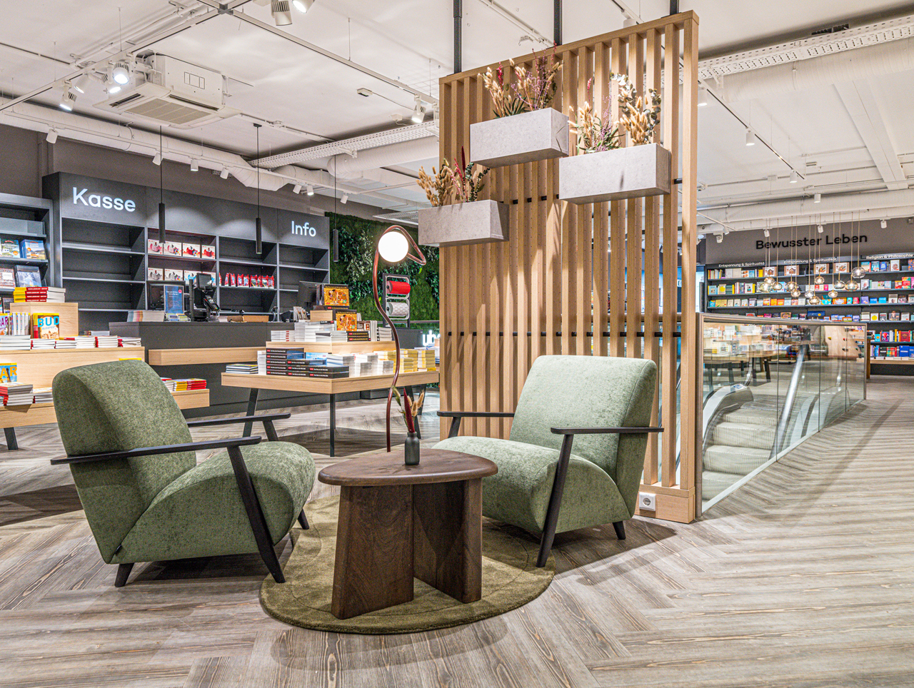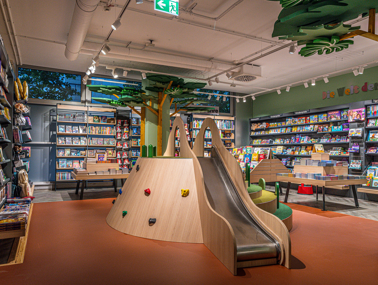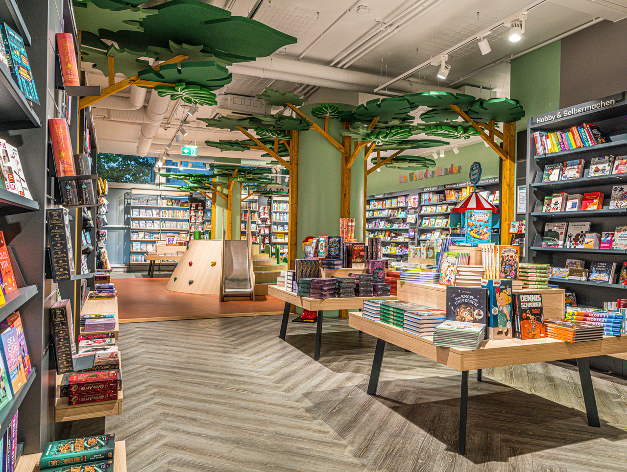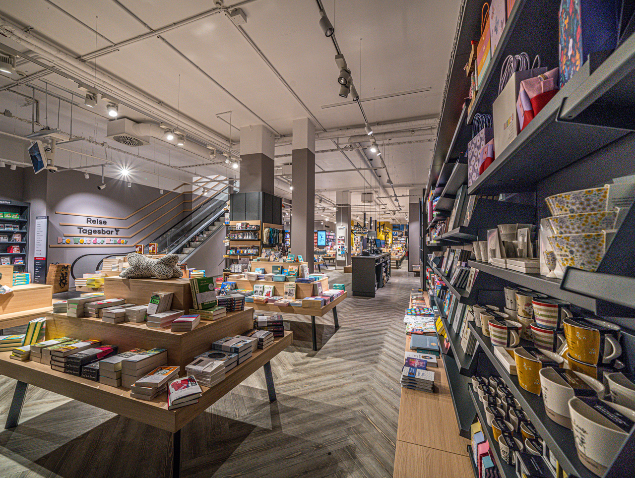 Die neue Verkaufsfläche erstreckt sich über zwei Etagen. Im Erdgeschoss finden sich Unterhaltungsliteratur, englischsprachige Titel, Kalender sowie die atmosphärisch inszenierten „Fantastischen Welten“, in denen auch ein Legami-Marken-Shop mit Papeterie, Geschenkideen und Lifestyle-Produkten angesiedelt ist. Das Obergeschoss richtet sich mit Kinderbüchern Spielgelegenheiten und einer Rutsche an Familien. Außerdem stehen hier Reise- und Sachliteratur, Sprachlernmaterialien sowie Ratgeber.