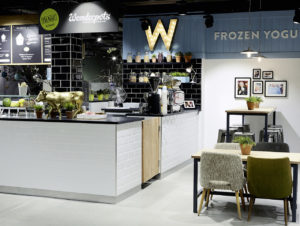 Eine Schweizer Premiere ist der Shop-in-Shop der deutschen Start-up-Firma Wonderspots, die sich auf das Angebot von Frozen Joghurts spezialisiert hat und in Berlin 3 Verkaufspunkte unterhält. Die Anordnung der „Marktstände“ auf dem dreieckigen Grundriss wirkt verschachtelt, der Besucher muss sich das Angebot des Marktplatzes erschließen. Auf eine Kundenführung mittels Wegeleitsystem wird verzichtet. Stattdessen geben großformatige, stimmungsvolle Schwarzweiß-Fotografien mit Motiven aus der Produktion eine erste Orientierung.