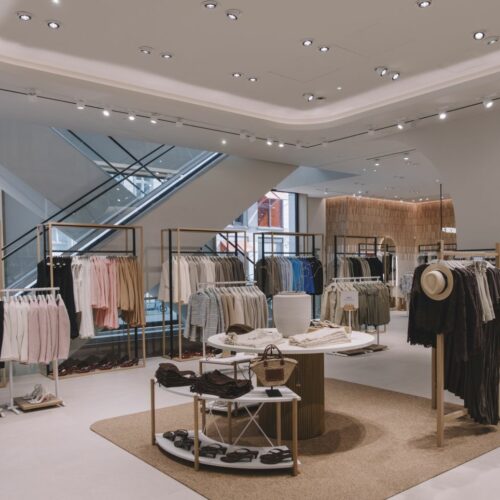 Der sechste Mango-Store in Berlin vereint Damen-, Herren- und Kinderkollektionen auf 1.100 qm. Die Gestaltung folgt dem Ziel, eine wohnliche Atmosphäre zu schaffen, in der Mode und Raumgestaltung zu einem Erlebnis verschmelzen. Warme Erdtöne treffen auf handgefertigte Elemente wie Keramik, Leinen und Holzoberflächen, ergänzt durch großzügige Sitzbereiche und viel Tageslicht.