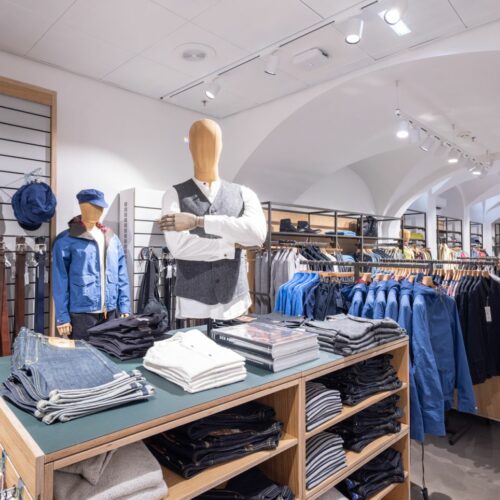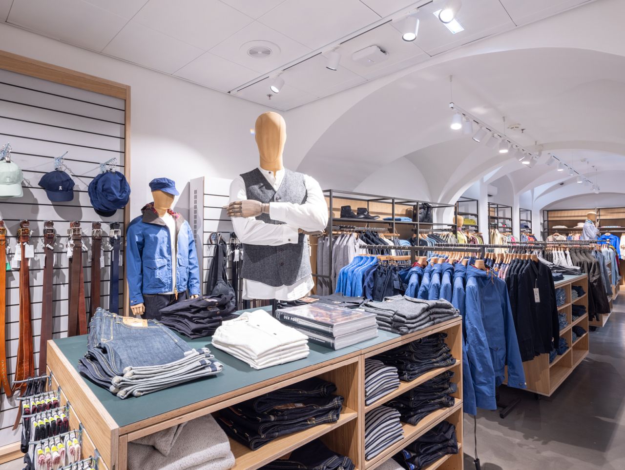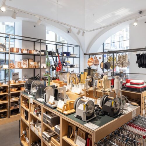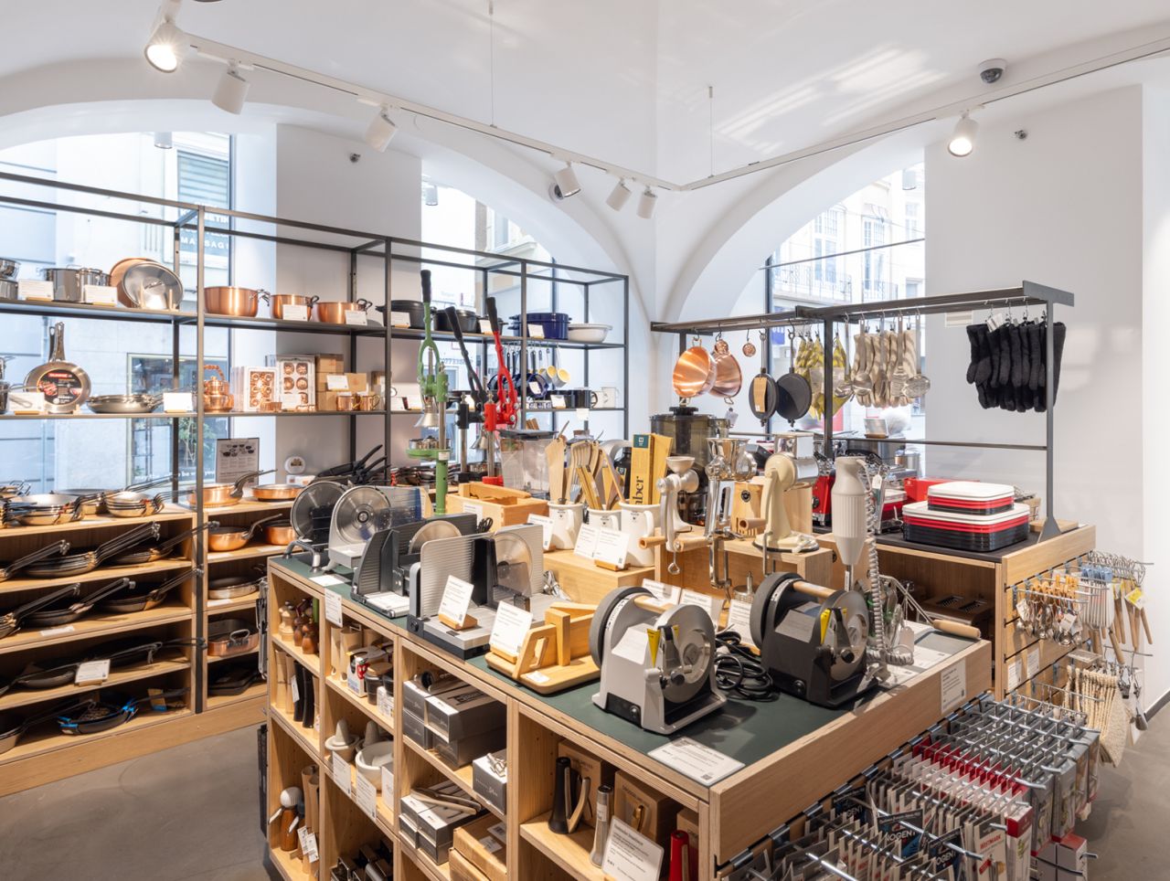 Der Store bietet ein Sortiment aus Heimtextilien, Küchenutensilien, Gartenbedarf, Büroartikel, Körperpflege, Lebensmittel und Bekleidung auf über rd. 520 qm Verkaufsfläche. Die historischen Gewölbestrukturen leiten Kund:innen durch die verschiedenen Abteilungen, der lichtdurchflutete Innenhof mit Glasdach prägt das Erscheinungsbild. Das Düsseldorfer Team von Schwitzke & Partner setzt auf modulare Warenträger aus heller Eiche, kombiniert mit dunklem Stahl und grünem Linoleum. Durch eine Stromschienenabhängung im 17 m hohen Innenhof werden die Mittelraummöbel gezielt beleuchtet.
