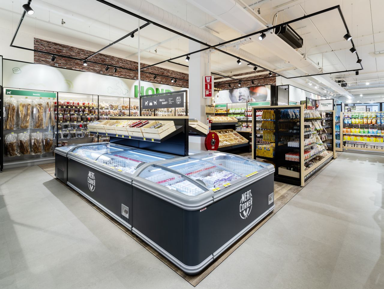 Im sogenannten „Meat Corner“, bestehend aus anthrazitgrauen Möbeln und Holzkisten, finden Kund:innen neben napffertigen Menüs einzelne Komponenten, um Futterkompositionen für ihre Vierbeiner selbst zusammenzustellen.