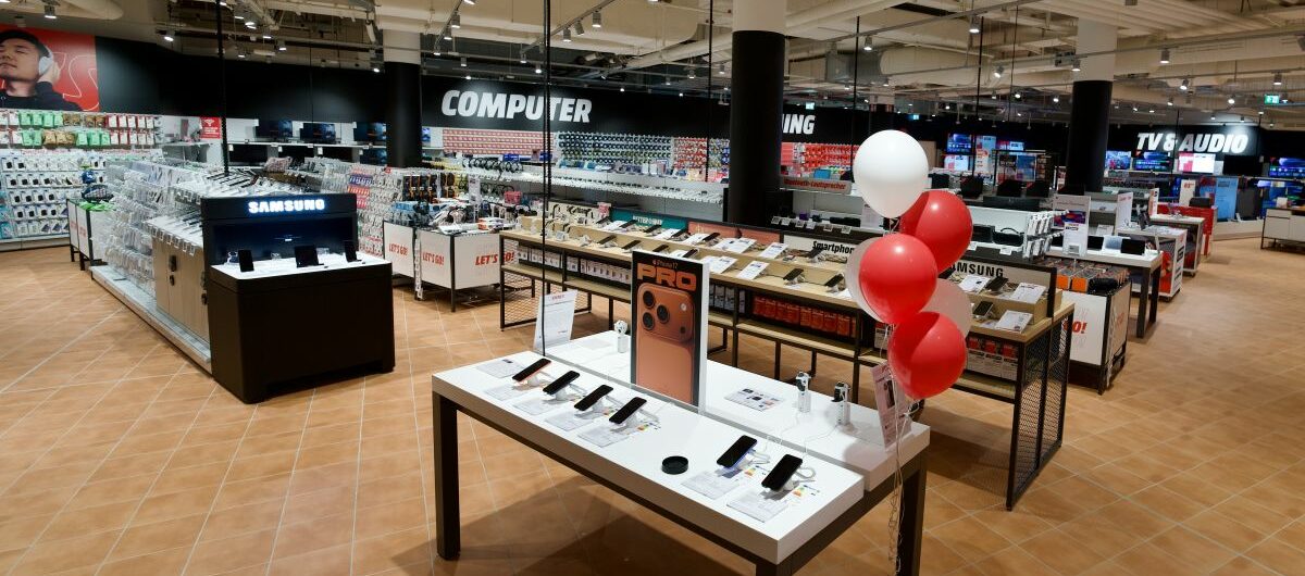 Das Konzept des 800 qm großen Stores verbindet eine kompakte Sortimentspräsentation mit einem durchdachten Omnichannel-Angebot. Kund:innen können Produkte vor Ort testen oder per Click & Collect online bestellen und in vielen Fällen bereits nach 30 Minuten abholen. Großgeräte wie Fernseher oder Waschmaschinen werden direkt im Markt übergeben und können bequem ins Auto verladen werden. Die übersichtliche Beschilderung sowie eine klare Aufteilung der Abteilungen sollen den Einkauf zusätzlich erleichtern.